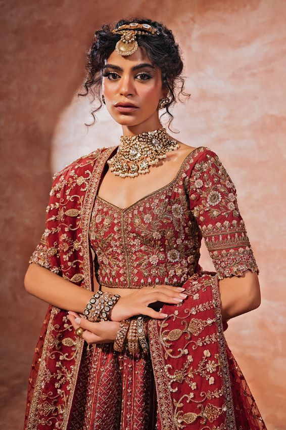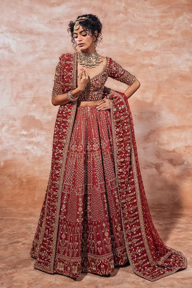 This is a stellar deep red outfit with a detailed neckline, highlighting the very delicate embellishments over it. It is adorned with a rich border of cascading floral lines and the exquisite merge of various embroidery techniques; resham diamanté, tilla, gota and zardozi and the elegant motifs over the front and back. The motives on the fitted sleeves and the chiffon dupatta encapsulate a distinctive look with embellished sequin, gota, naqshi, dabka, resham and kat danna as well as diamanté. The jamawaar lehnga has a richly embellished border underneath