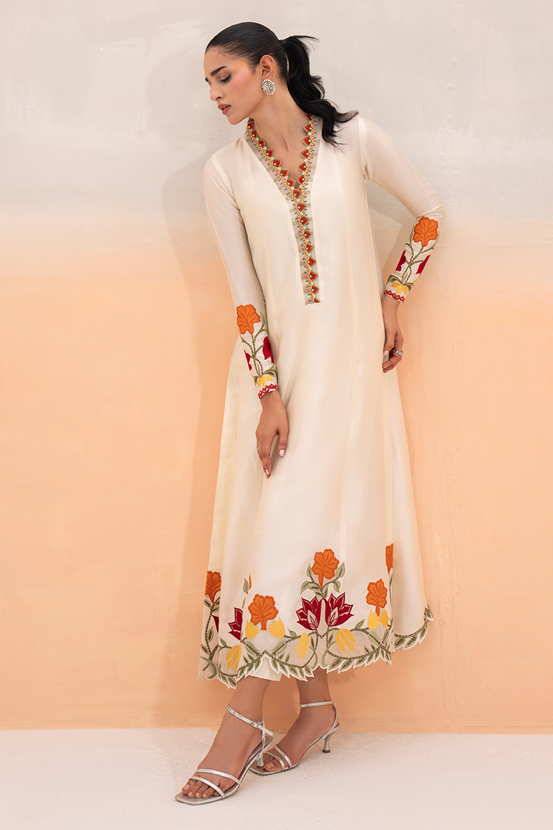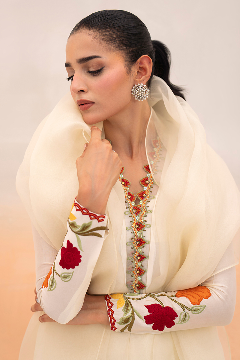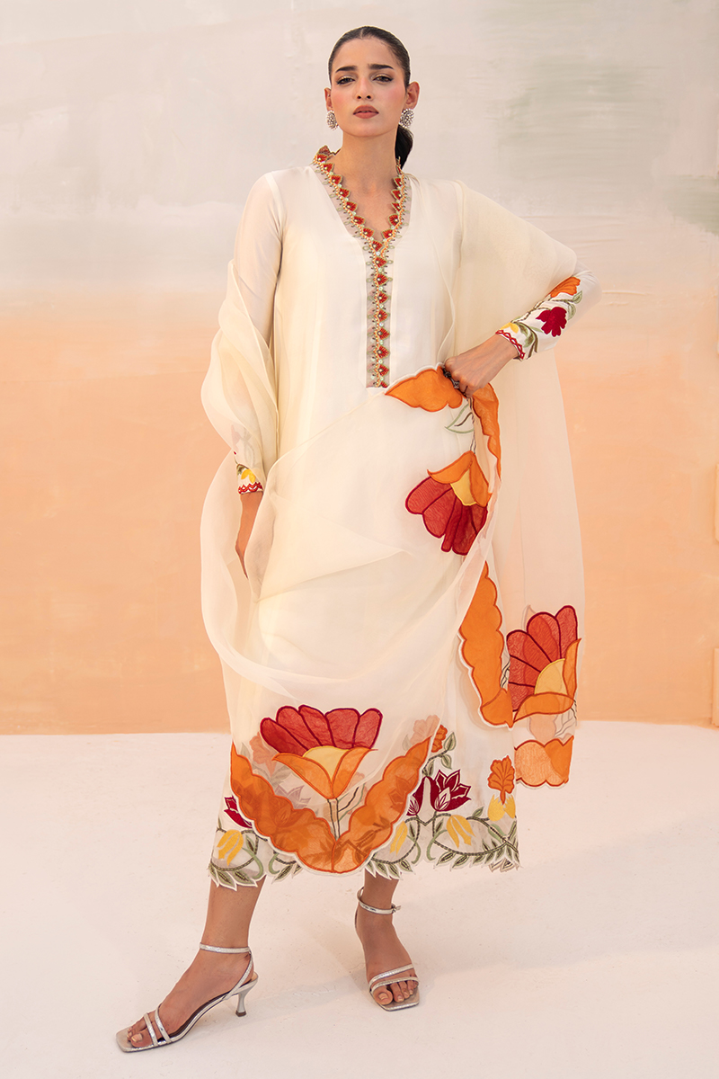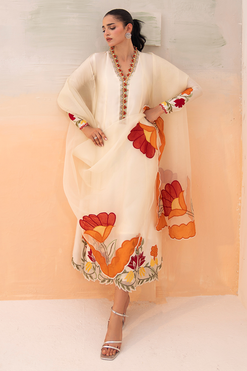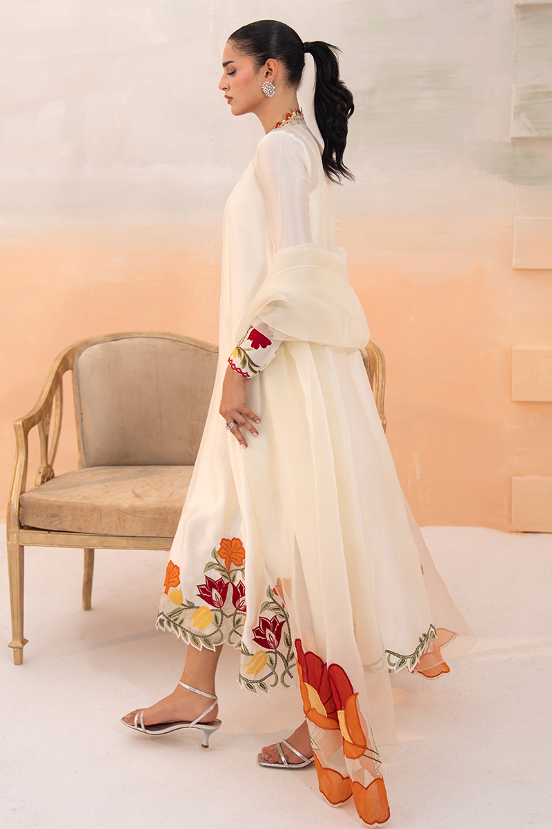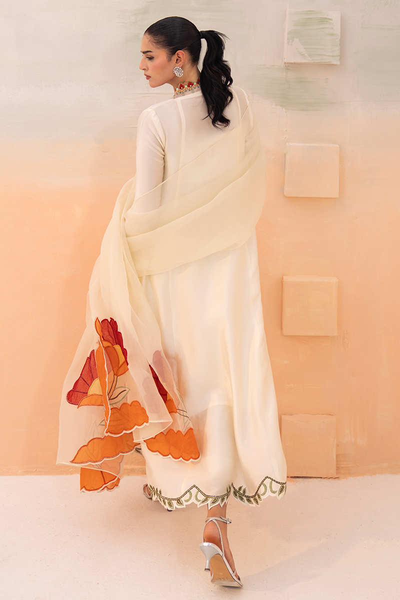 A silk ivory-hued long A-line shirt in tissue silk, cut in elegant panels for fluid movement. The V-shaped neckline is adorned with bright spring floral embroidery that flows gracefully, while delicately appliquéd floral motifs enhance the hem, finished with scalloped cutwork for artisanal detail. The fitted sleeves are refined with embroidered hems, adding balance and sophistication. Completing the look is a pure organza dupatta, edged with scalloped appliqué floral motifs that lend a sheer, ethereal charm. An additional PK silk trouser accompanies the ensemble, offering structure and understated elegance to the overall composition.