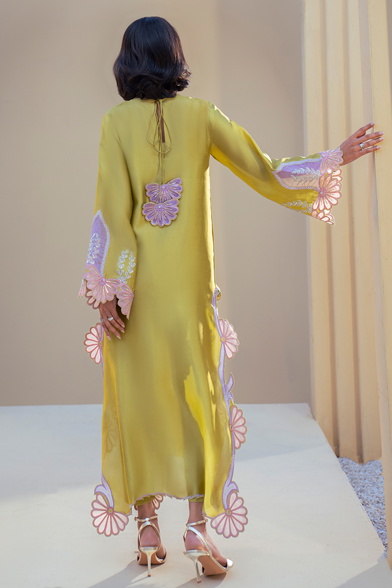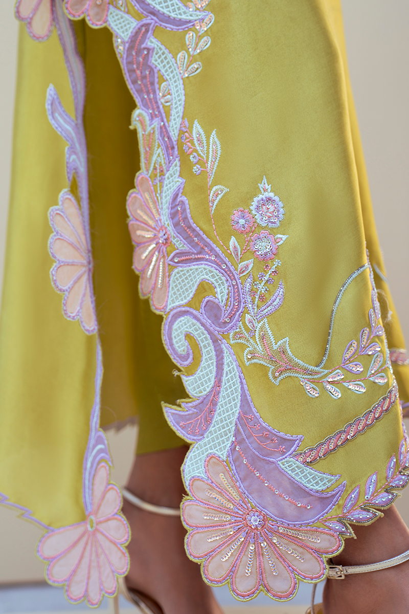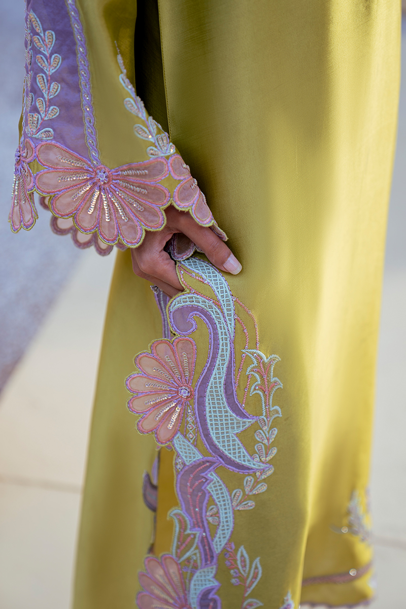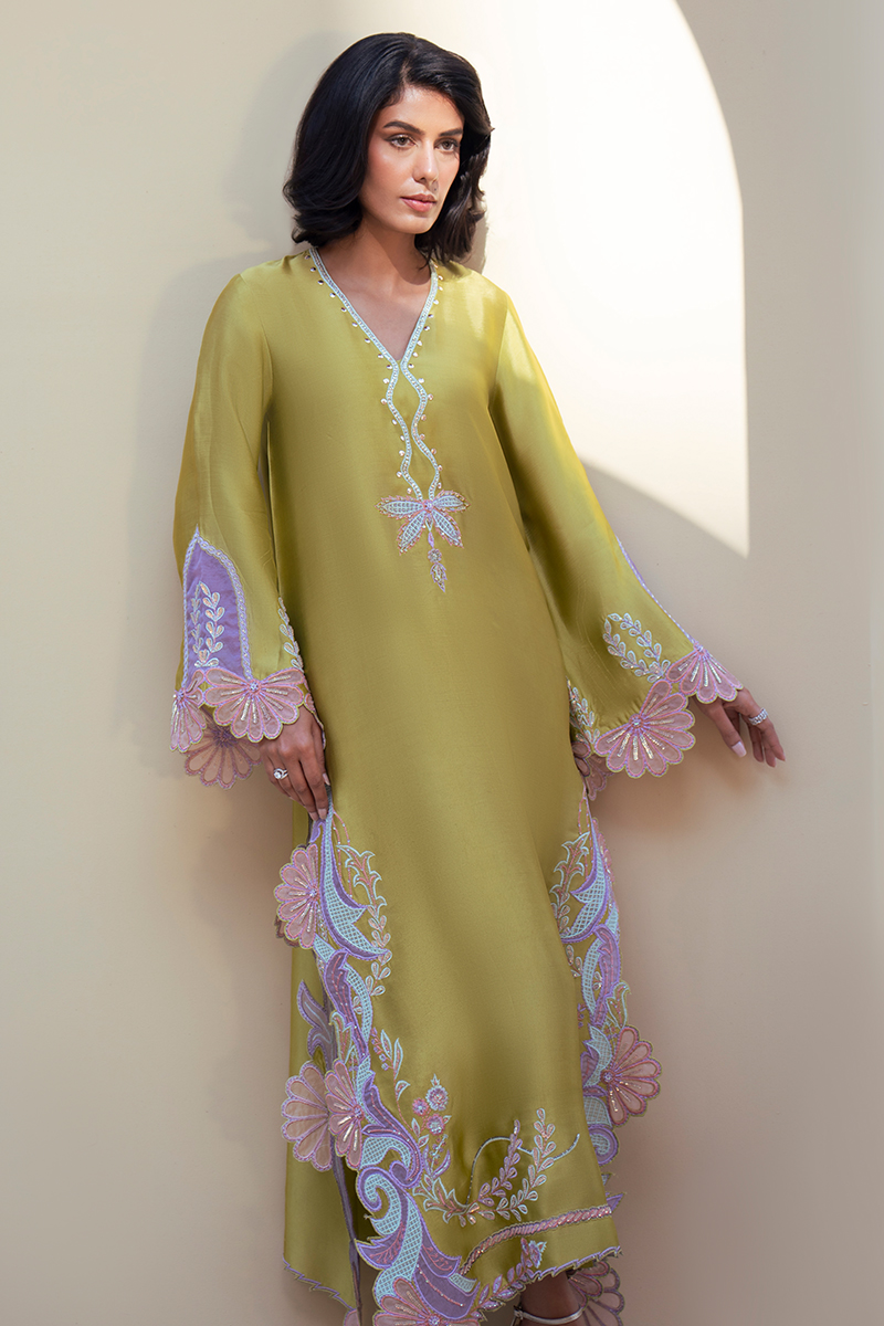 A stunning chartreuse sheesha silk kaftan crafted to make an elegant statement. The V-shaped neckline is adorned with intricate kamdani embellishment, flowing seamlessly into a beautifully detailed floral motif. The back neckline is finished with hand-embellished floral tassels, thoughtfully designed to complement the front detailing. Floral motifs throughout the kaftan are hand-embellished with different shades of appliqué in fresh lavender and peach spring tones, creating a soft yet striking contrast against the chartreuse base. The bell-bottom sleeves add a graceful, feminine touch.The slits and hem are richly decorated with flowing floral motifs, also hand-embellished in refreshing spring hues, wrapping beautifully around the silhouette for a statement finish.This exquisite ensemble is paired with matching silk pants and a silk dupatta, making it perfect for festive occasions and special gatherings.
