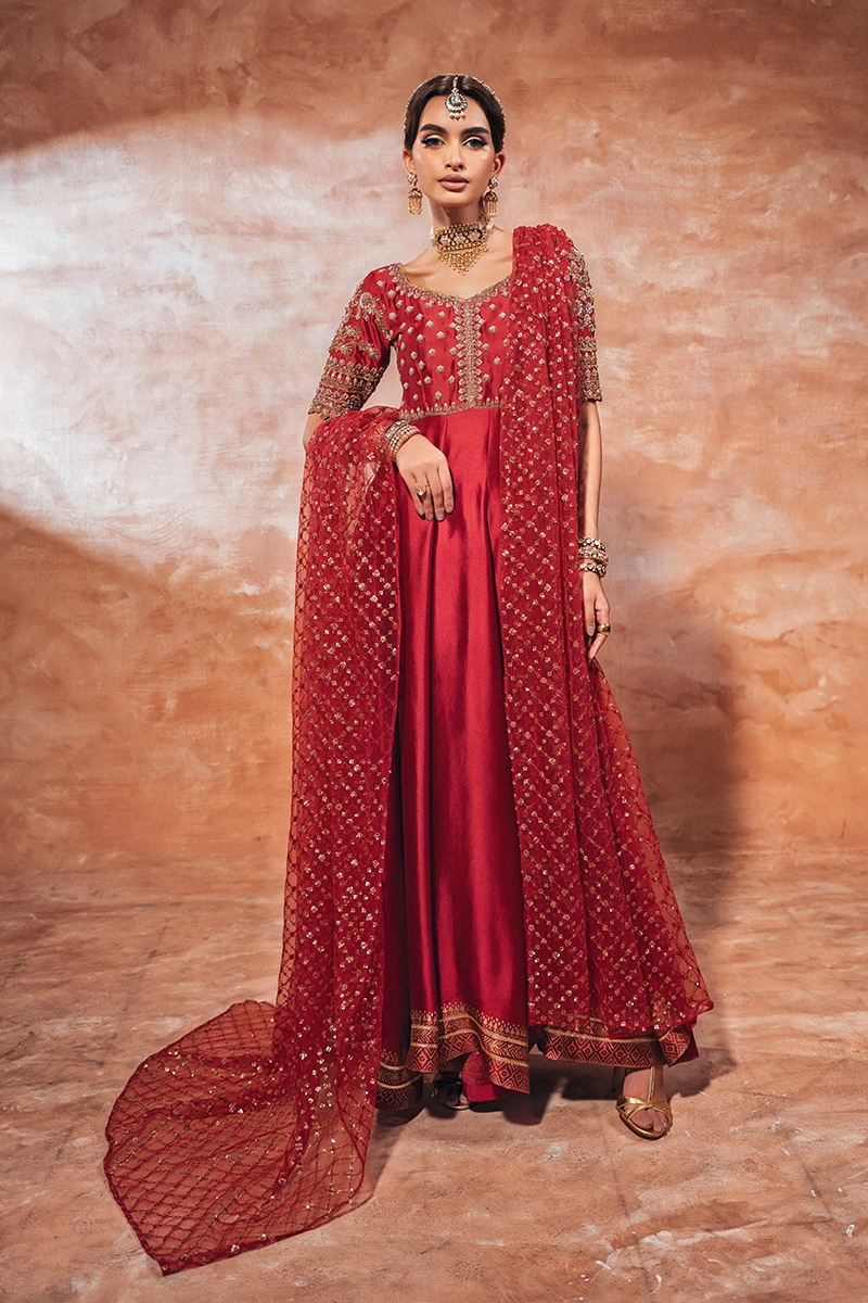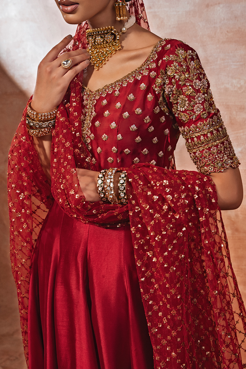 Make a majestic statement in this stunning, hand-embellished Tissue Silk red Kalidar set, complete with a show-stopping sequin-laden tulle dupatta and luxurious silk churidar. Perfect for weddings, festivals, or special occasions, this ensemble exudes opulence and sophistication.