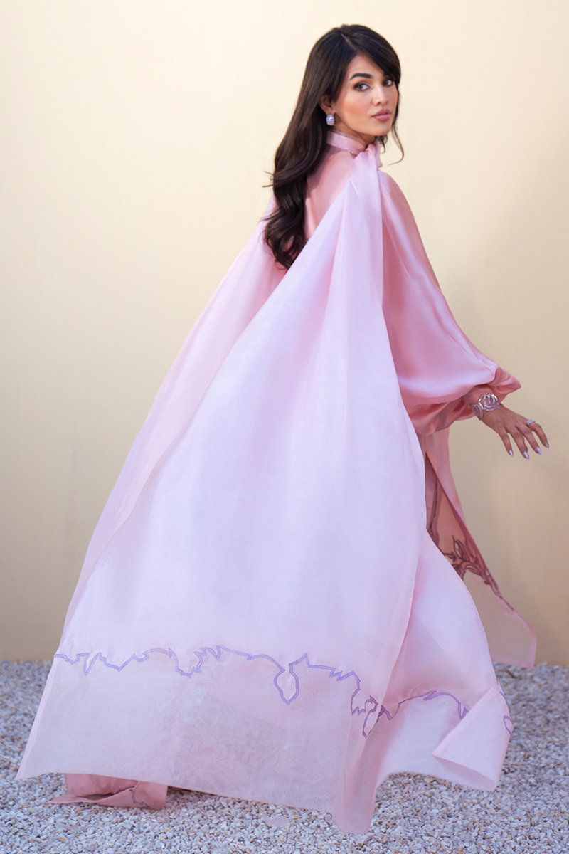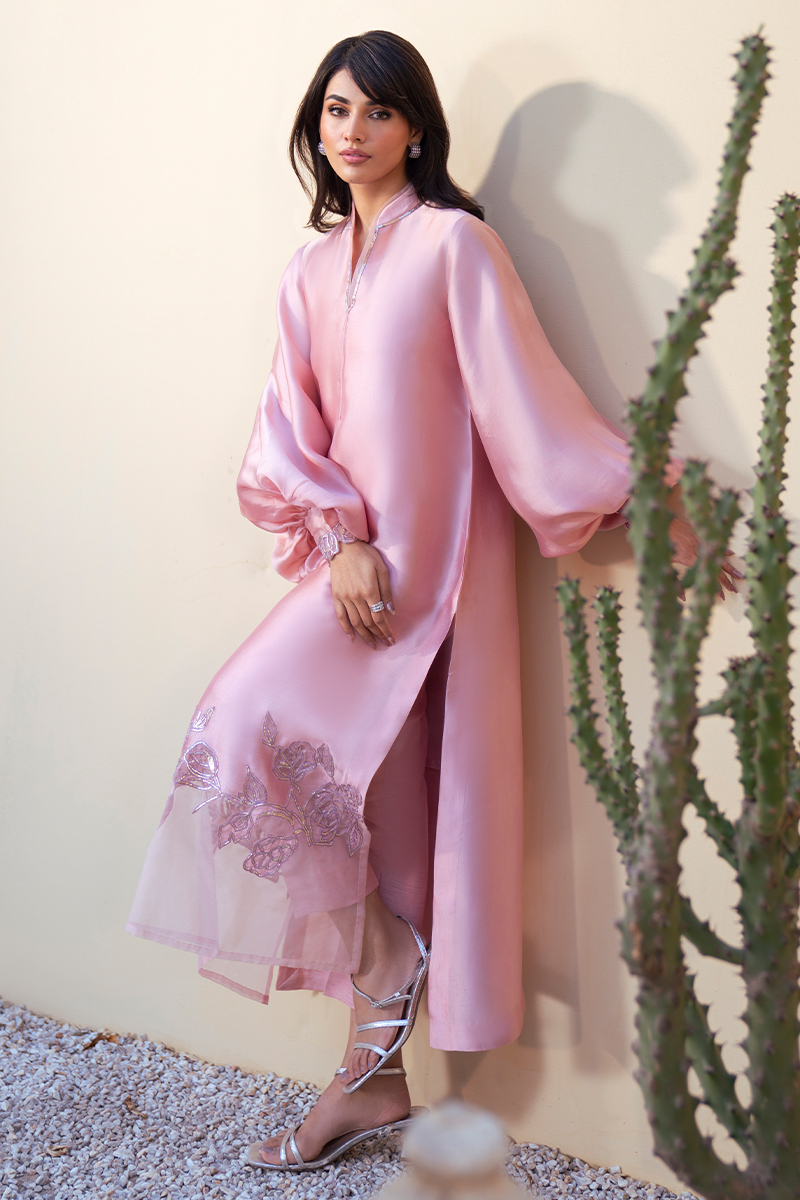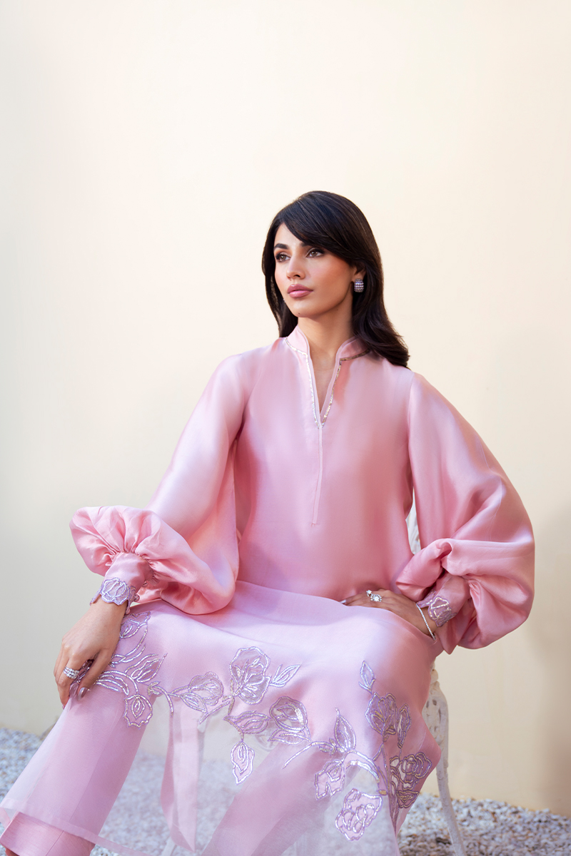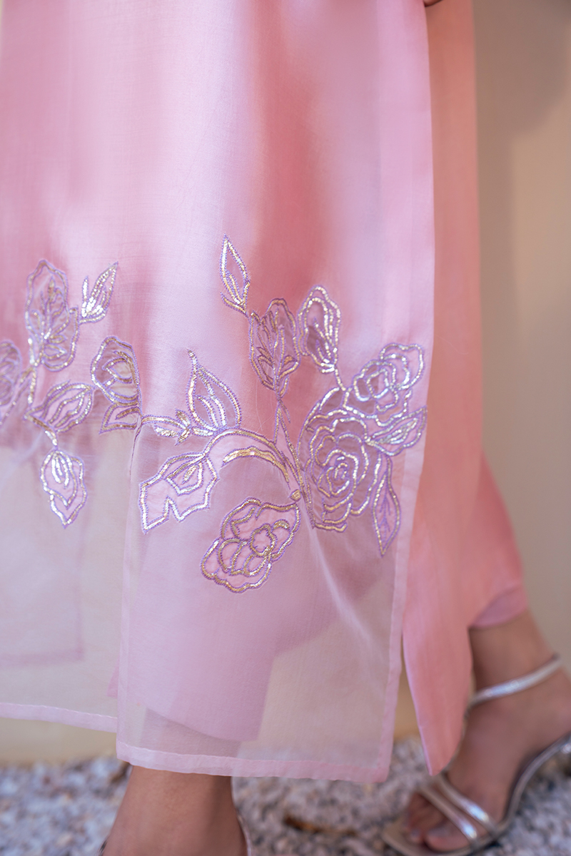 Rendered in a delicate Pastle Pink hue, this pure silk shirt exudes timeless luxury. The ban V‑shaped neckline is elevated with intricate rose gold pitta work, lending a refined shimmer to the silhouette. Flowing into bishop‑cut long sleeves, the design embraces a graceful balloon touch, further enriched with pitta‑embellished detailing for artisanal depth.The hemline is exquisitely finished with floral appliqué in pure organza, outlined with rose gold pitta embellishment and cutwork precision, creating a harmonious balance of texture and elegance. Completing the look, a silk dupatta mirrors the floral artistry of the shirt hem, enhancing the ensemble with tonal sophistication.This creation is a serene expression of heritage craftsmanship reimagined in contemporary luxury, perfect for festive and formal occasions.