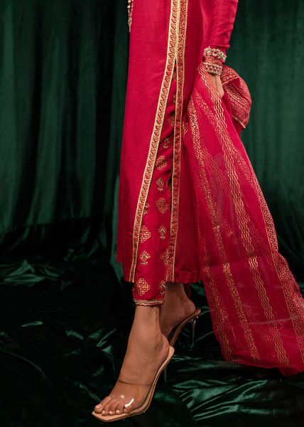 The magenta long shirt has a intricately hand embellished neckline with sequin, resham, naqshi, dabka, pitta and gota work. Further adding omph to the outfit handblocked chaak with gota work detailing. Paired with a gold blockprinted organza dupatta and a blockprinted silk trouser with pitta work.