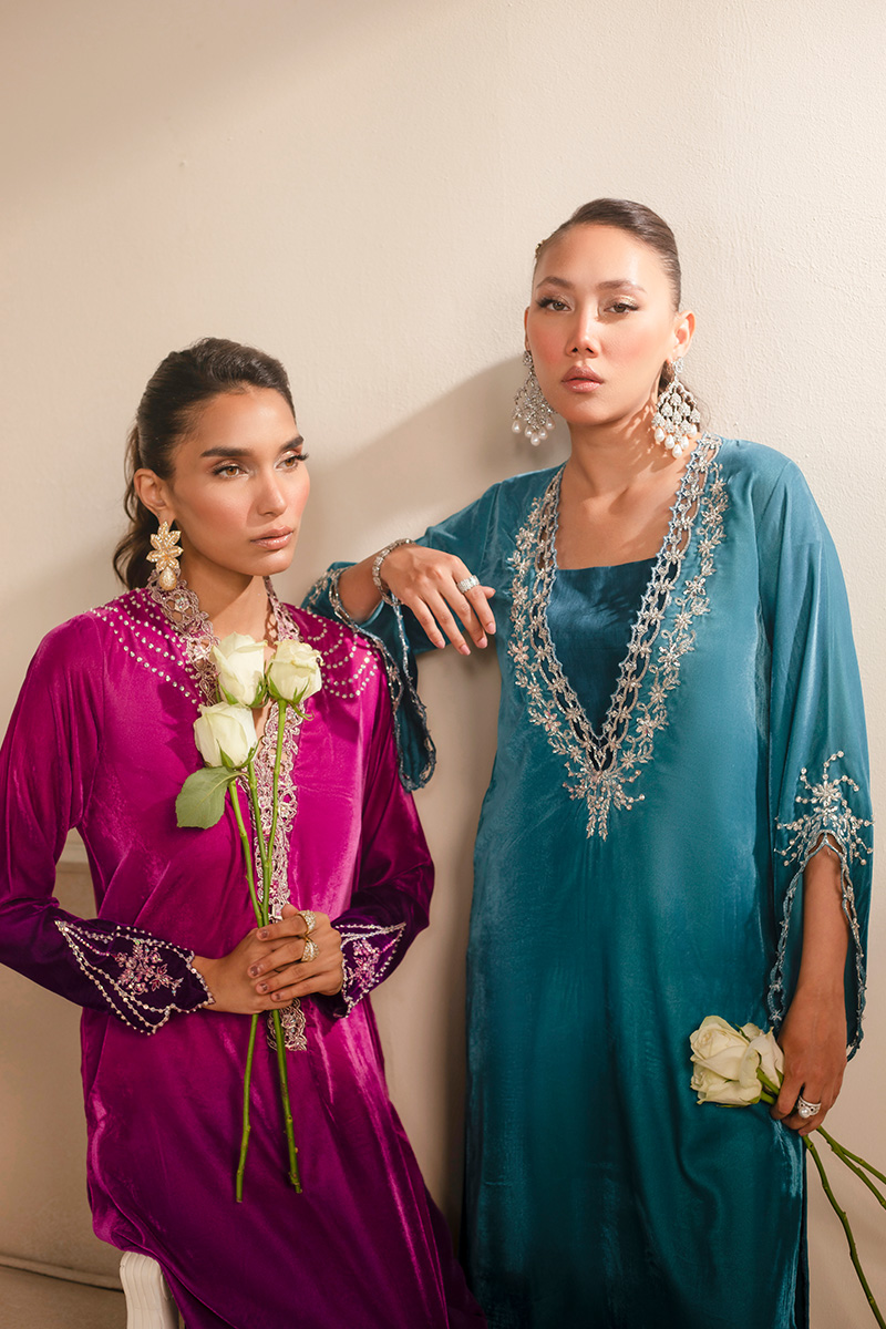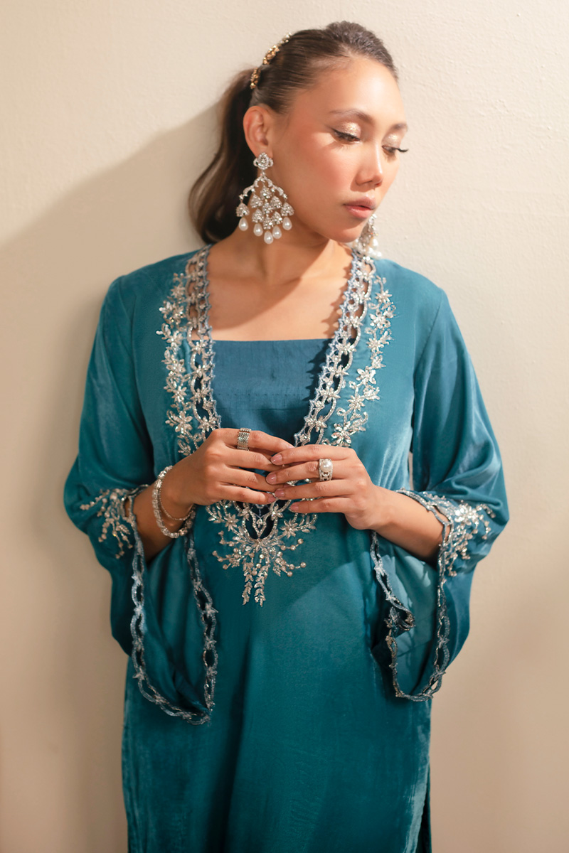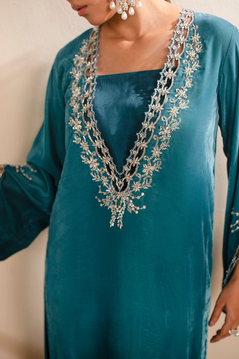 This stunning velvet ensemble features a luminous shade of teal and blue with a straight kaftan style silhouette. The eyecatching V neckline draws attention with its exquisite embroidery in contrasting silver tilla and is further accented with dark stones creating depth and layers. Unique detailing is found on the sleeves, featuring split cuffs highlighted by the continuation of of silver embroidery and decorative scalloping, making this a comfortable and classic look for all.