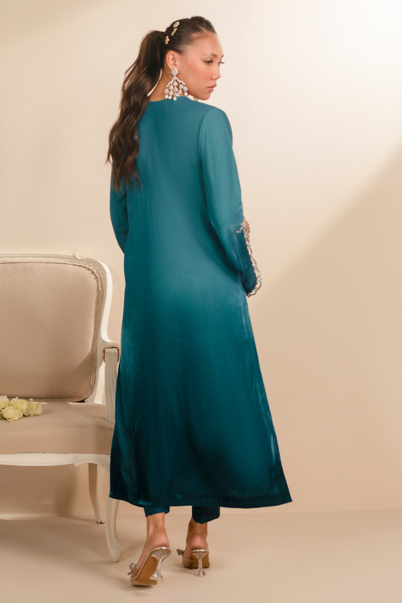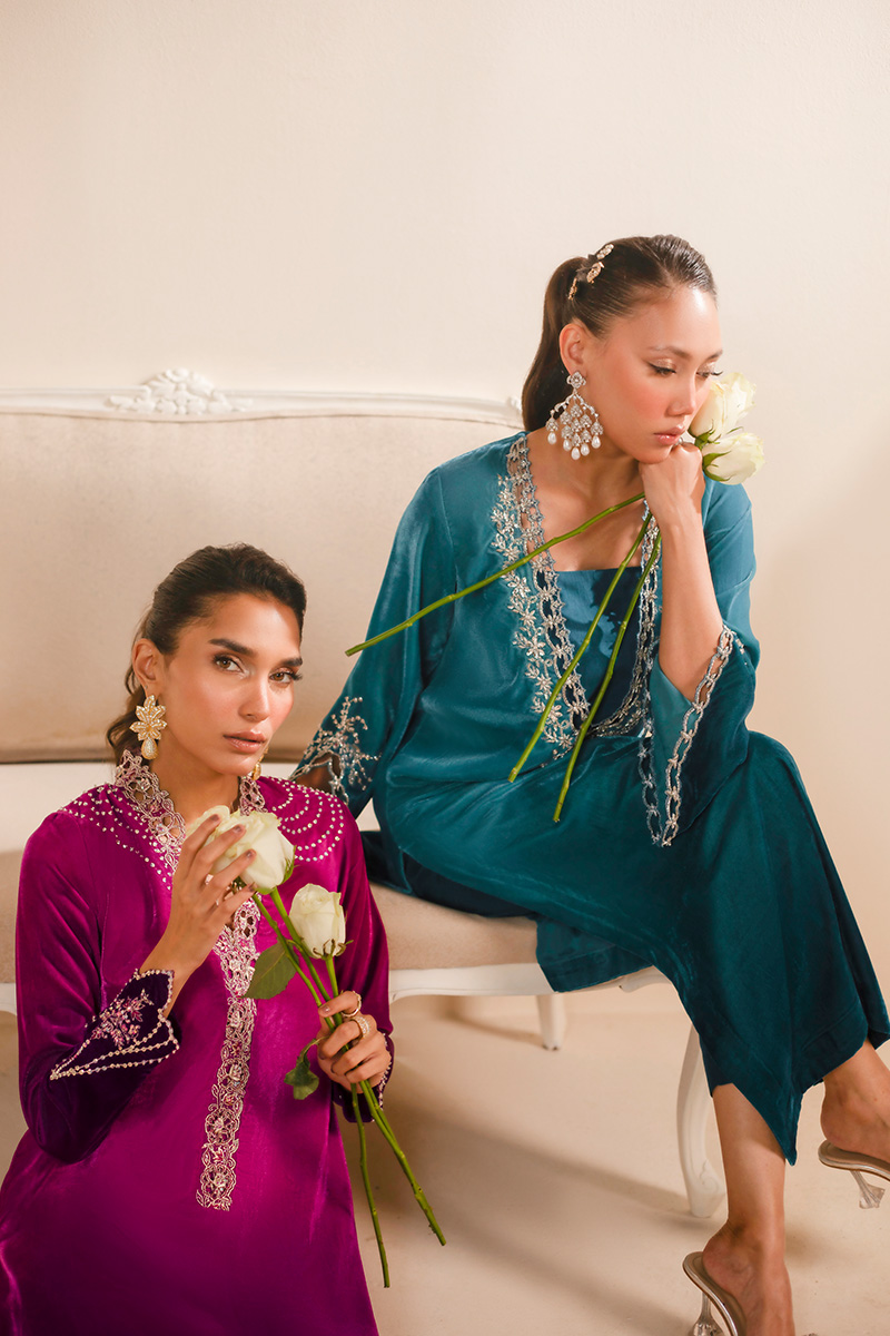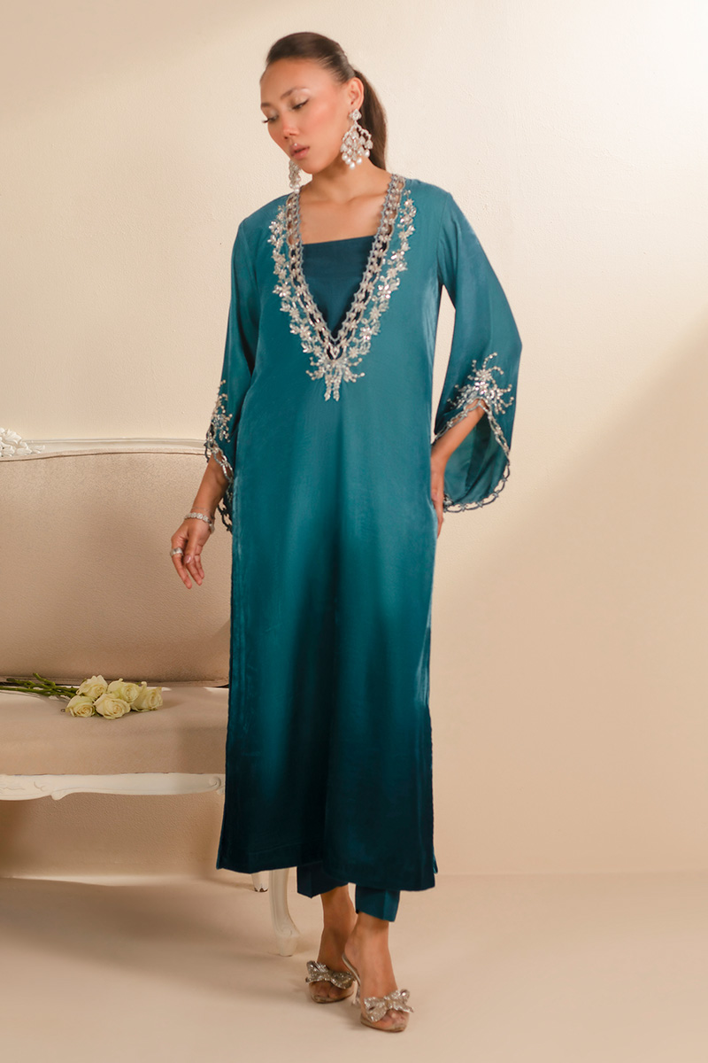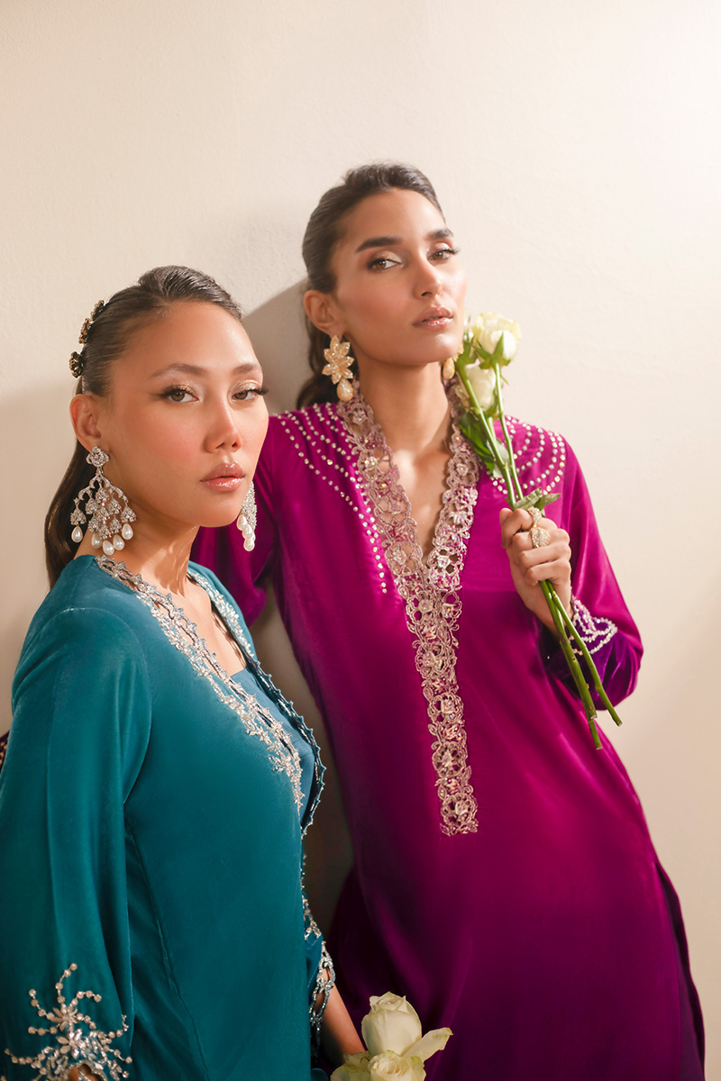 This stunning velvet ensemble features a luminous shade of teal and blue with a straight kaftan style silhouette. The eyecatching V neckline draws attention with its exquisite embroidery in contrasting silver tilla and is further accented with dark stones creating depth and layers. Unique detailing is found on the sleeves, featuring split cuffs highlighted by the continuation of of silver embroidery and decorative scalloping, making this a comfortable and classic look for all.