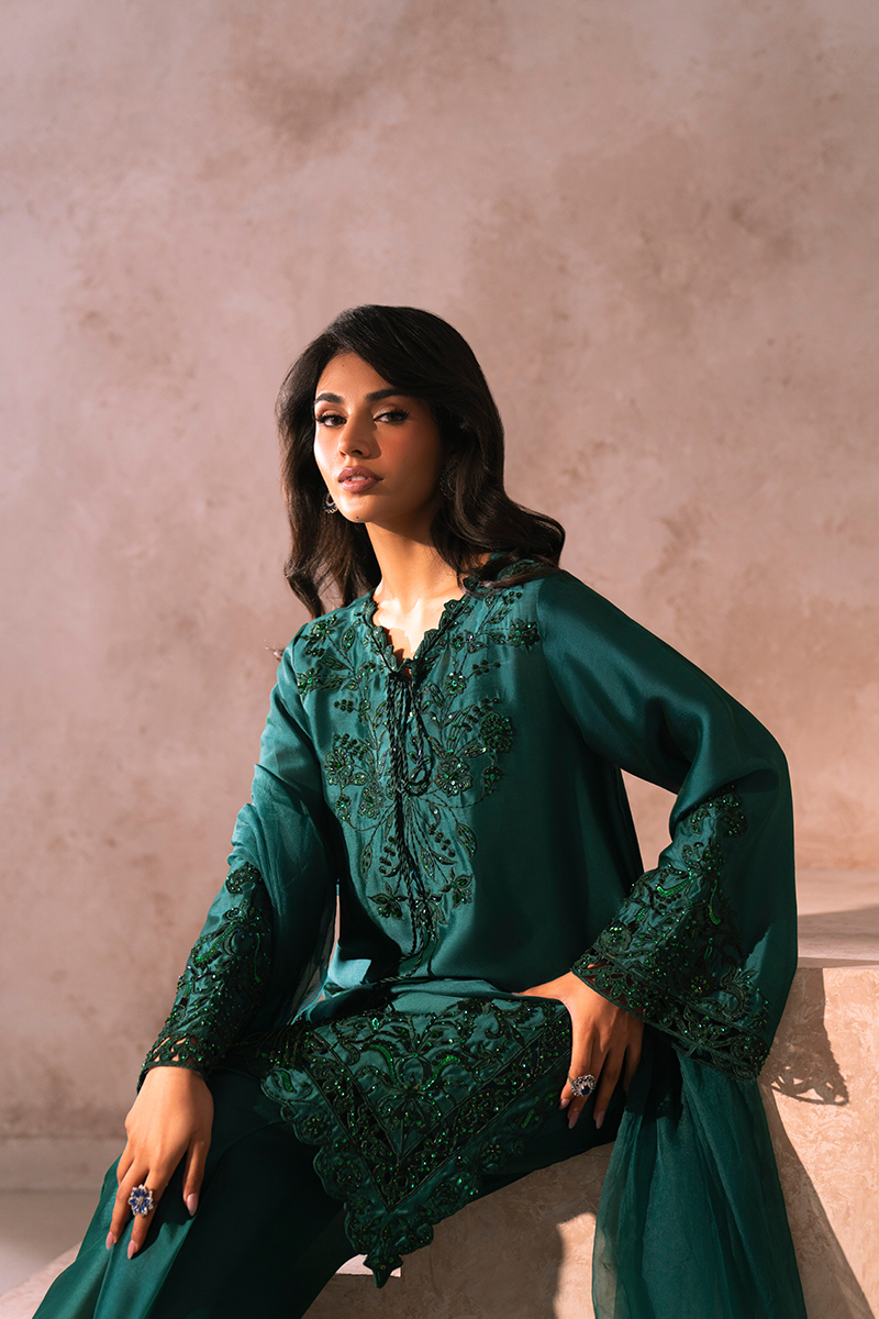 A Emerald green silk short shirt, exquisitely adorned with intricate resham embroidery, delicate zero-size sequin accents, and refined diamanté embellishments across the neckline, gracefully flowing into an elegant floral composition. The front neckline is finished with handcrafted tassels, adding a signature artisanal touch. The silhouette is enhanced with loose, fluid sleeves, embellished with coordinated embroidery and intricate cutwork, echoed along the shirt hem for a harmonious couture finish. Paired with a matching silk shalwar crafted from the same fabric, the ensemble is completed with a sheer organza dupatta, delicately finished with resham-embroidered edges and floral motifs adorning all four corners, creating a refined and timeless statement.