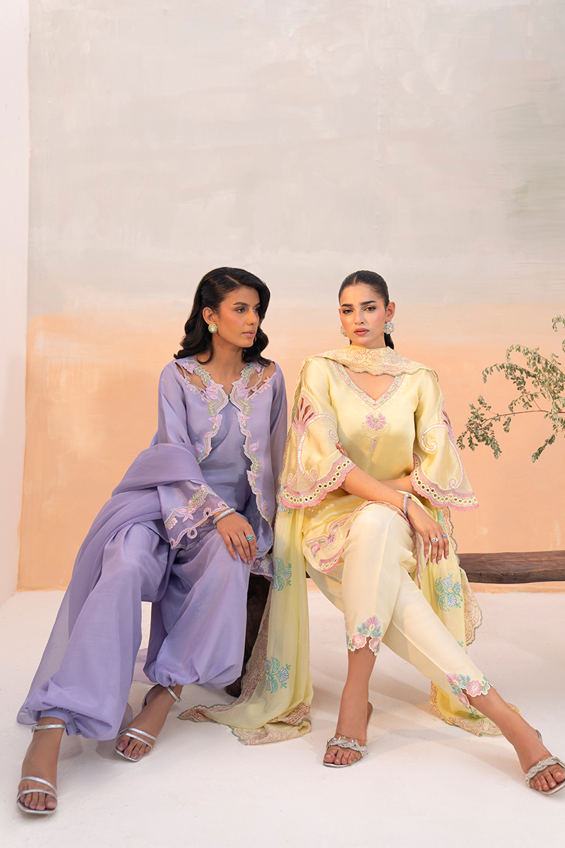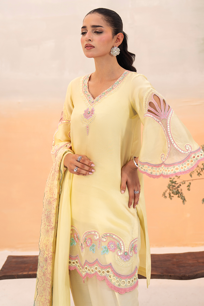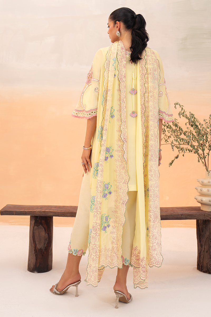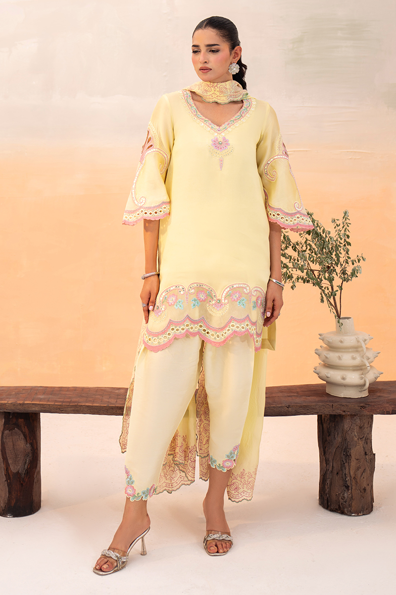 A radiant sunshine yellow shirt in fine tissue silk, designed with a graceful neckline embellished with flowing floral embroidery that extends across the front and back. Handcrafted tassel motifs accentuate the neckline, adding artisanal charm. The shirt is paired with a soft underslip for comfort and fluidity. A straight-cut shalwar complements the look, finished with delicately appliquéd floral motifs at the hem for a refined touch. Completing the ensemble is a medium silk dupatta, block-printed with floral patterns that cascade elegantly along its edges, balancing tradition with modern sophistication.