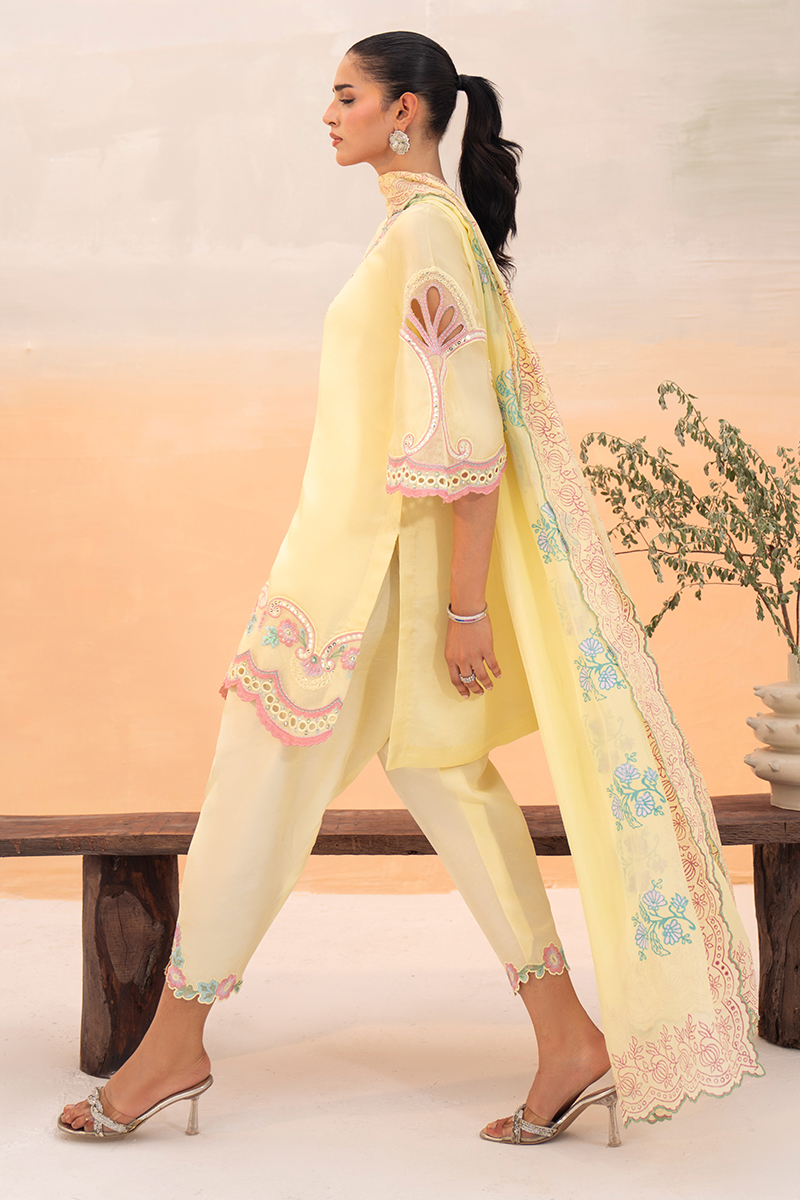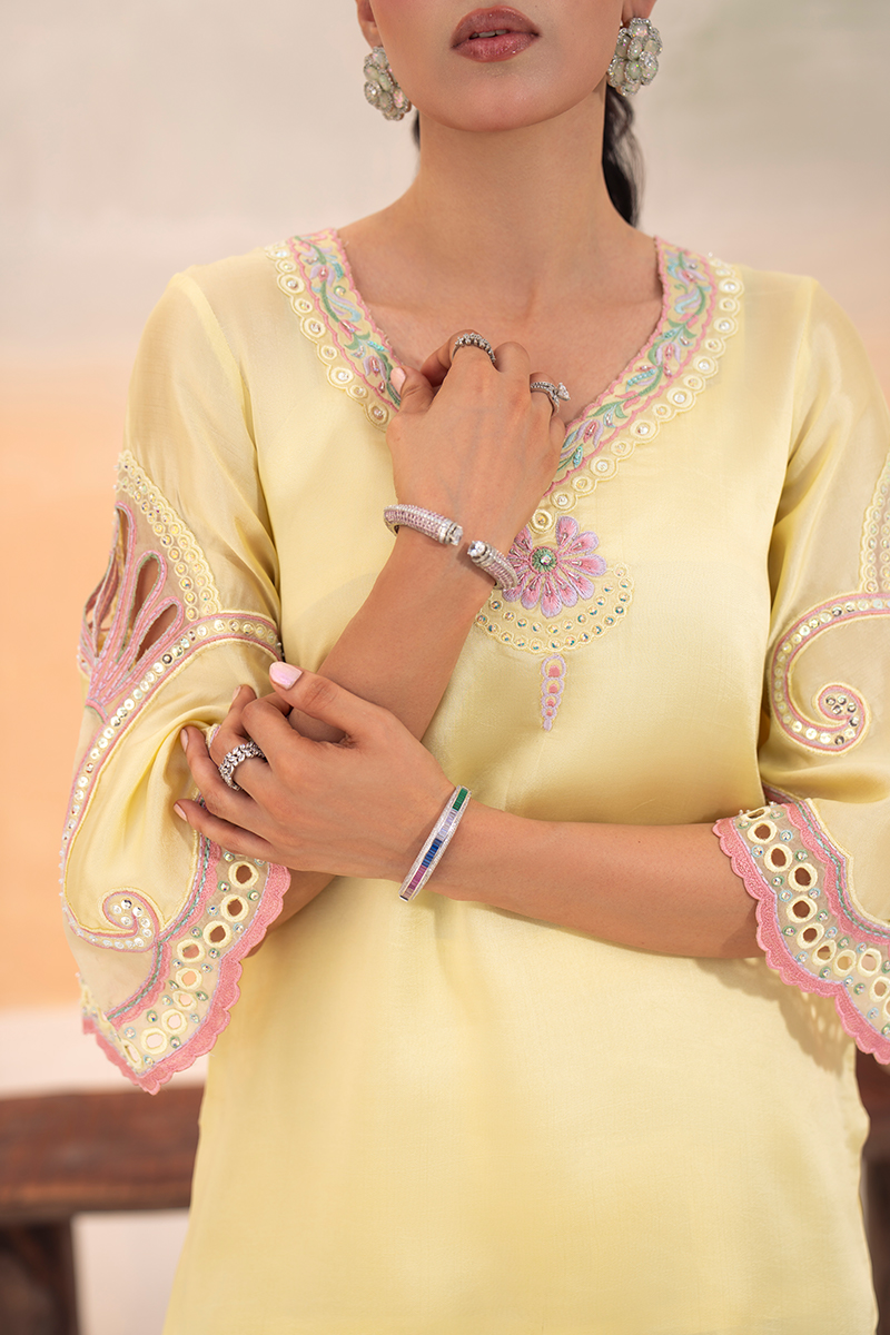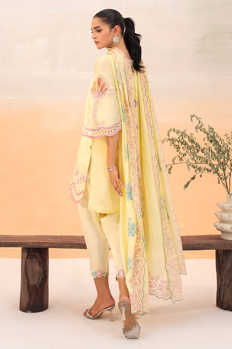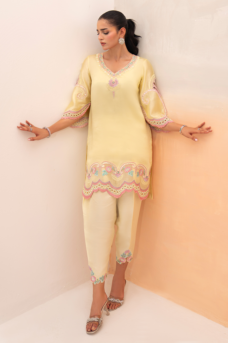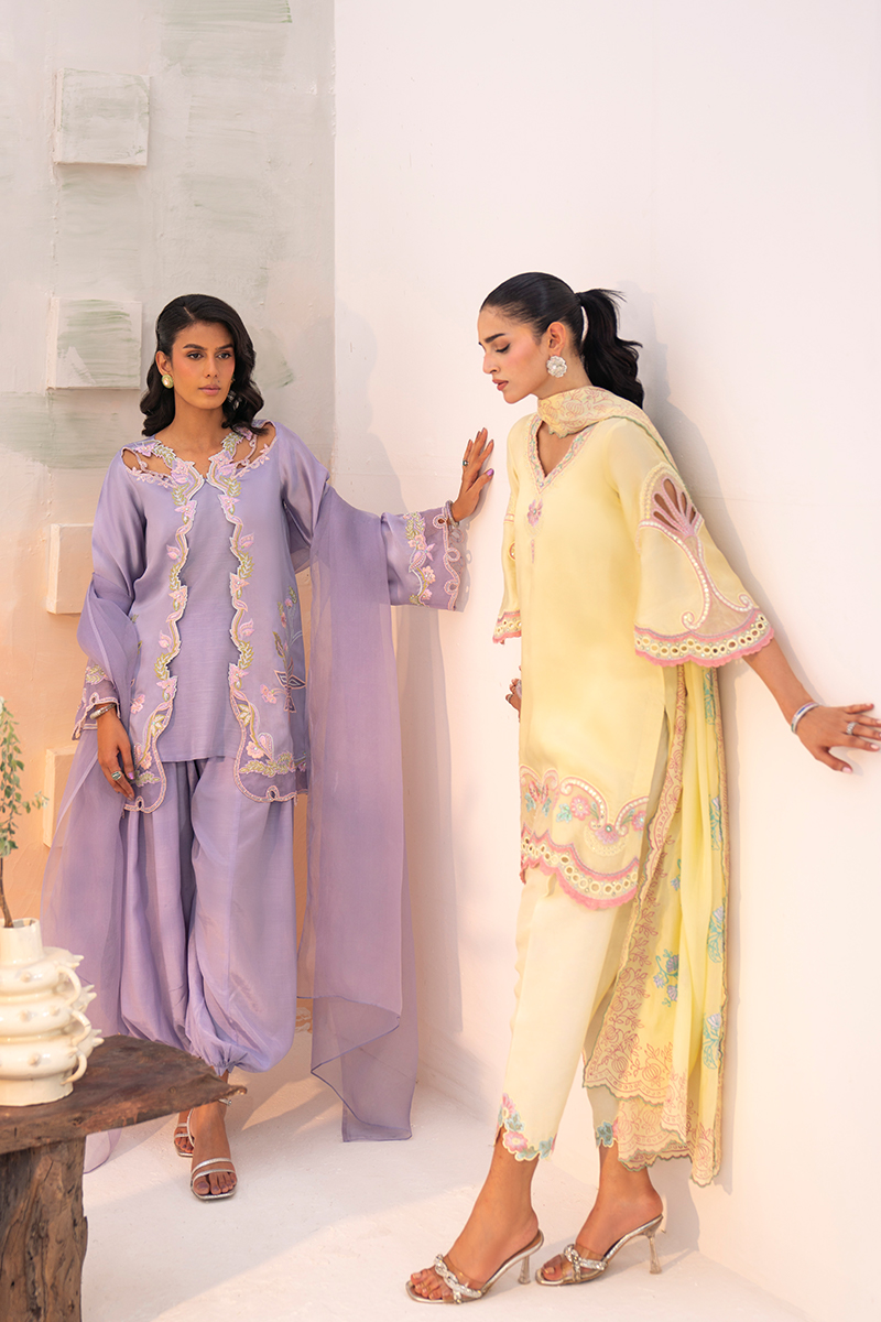 A radiant sunshine yellow shirt in fine tissue silk, designed with a graceful neckline embellished with flowing floral embroidery that extends across the front and back. Handcrafted tassel motifs accentuate the neckline, adding artisanal charm. The shirt is paired with a soft underslip for comfort and fluidity. A straight-cut shalwar complements the look, finished with delicately appliquéd floral motifs at the hem for a refined touch. Completing the ensemble is a medium silk dupatta, block-printed with floral patterns that cascade elegantly along its edges, balancing tradition with modern sophistication.