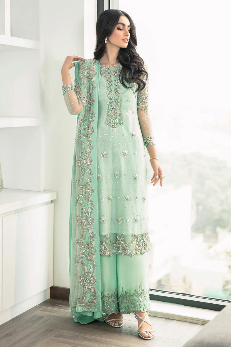 The soothing pastel hues highlight the handcrafted embroidery adorned with extensive detailing. A timeless reunion of refined elegance and creativity. Consisting of Sheesha Silk pants, slip and an embellished net shirt with net sequin dupatta.