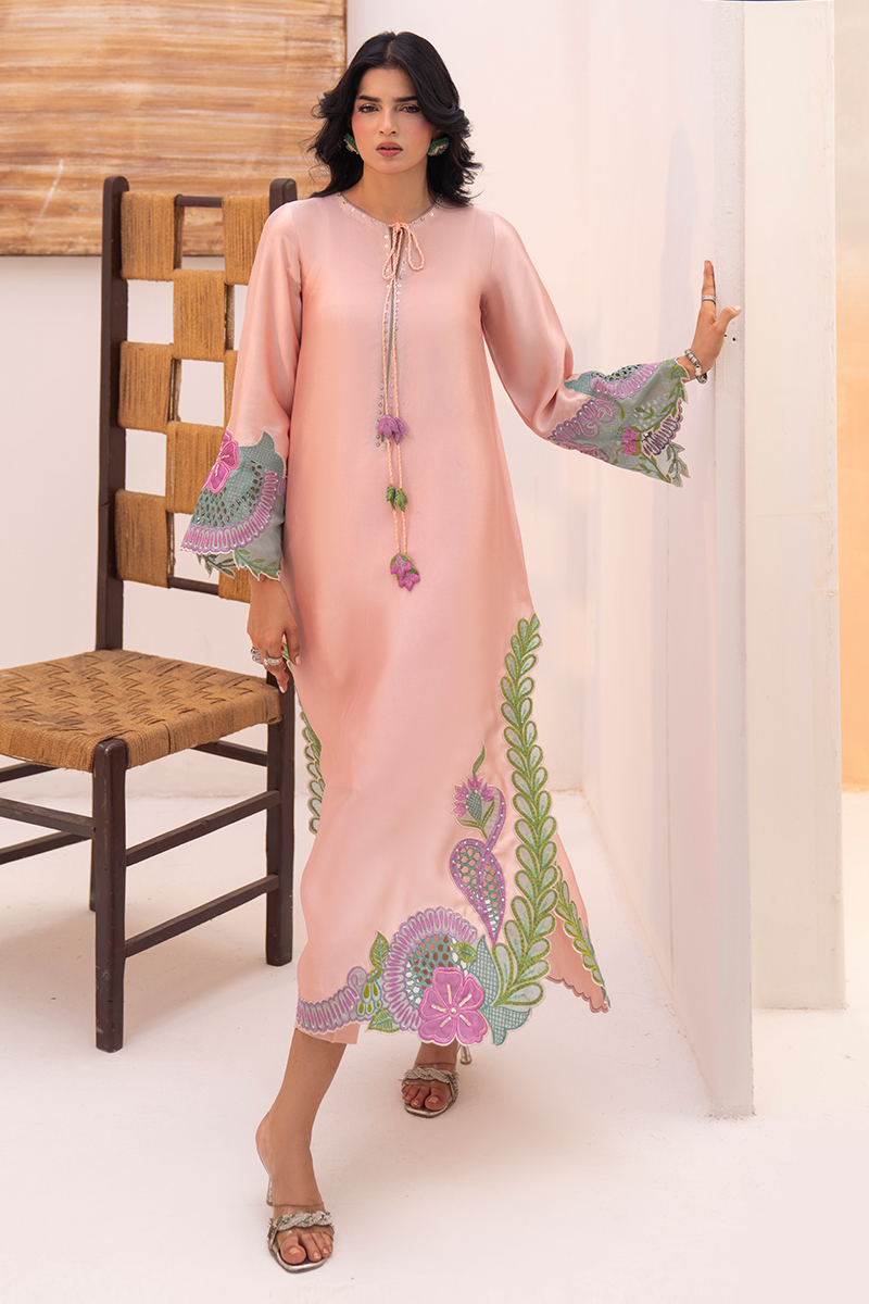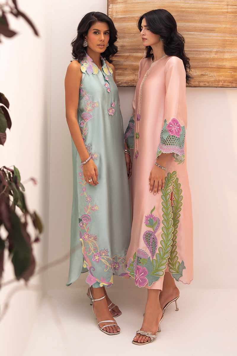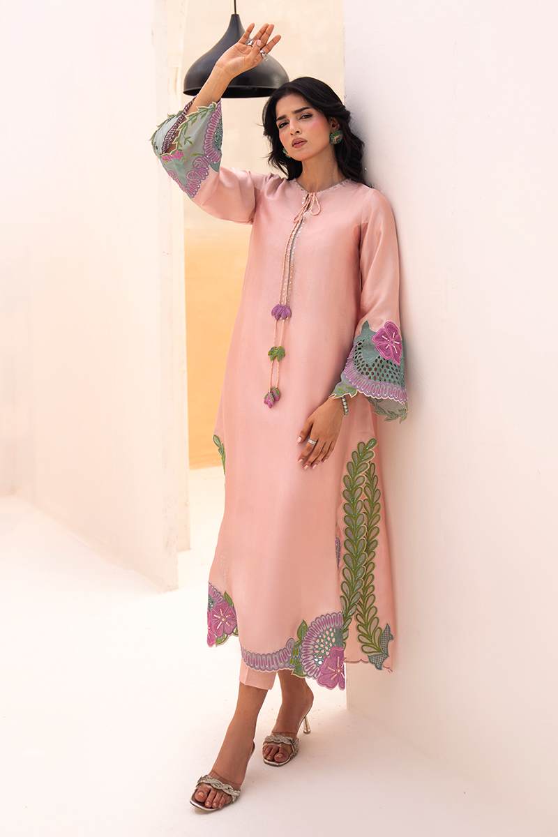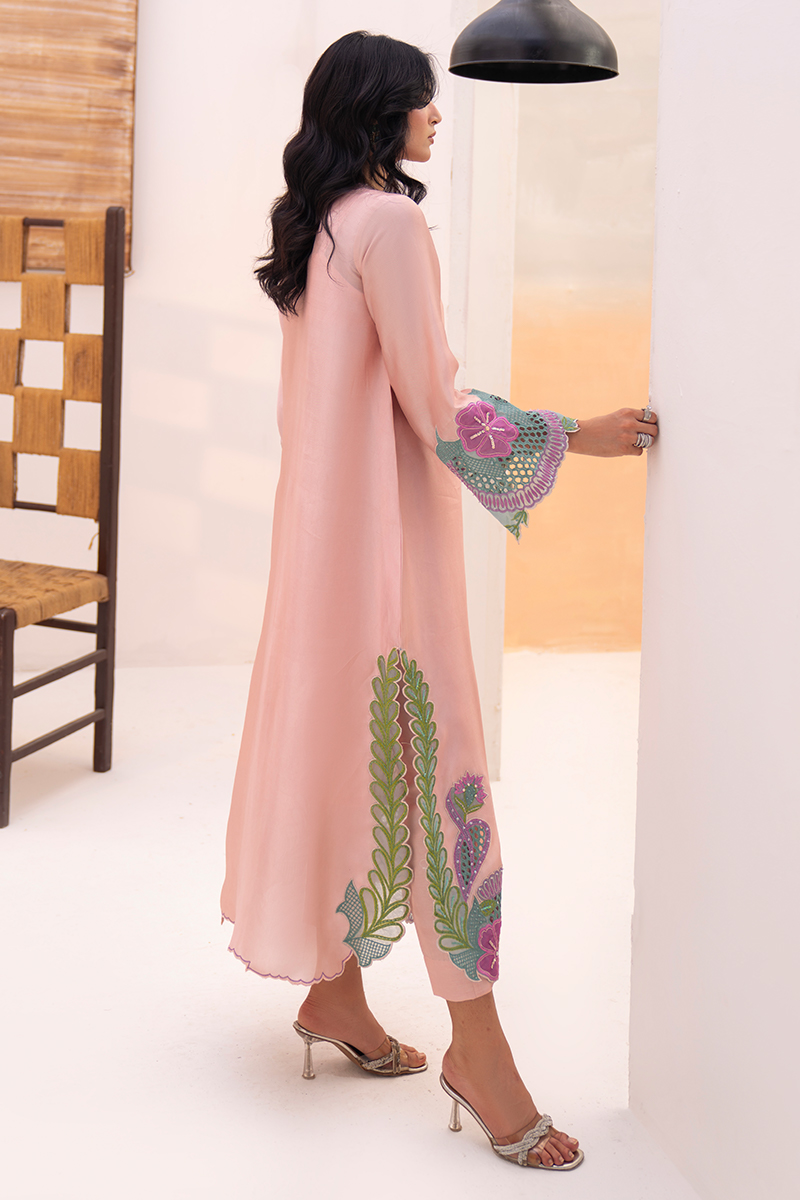 A beautifully crafted misty rose outfit featuring a shirt made from luxurious tissue silk. The neckline is adorned with delicate sequin detailing and intricately handcrafted leafy motif tassels, adding a signature artisanal charm to the ensemble. Handcrafted leafy motifs further enhance its elegance.The loose sleeves are intricately designed with fine appliqué, cutwork, and scalloped edges, enriched with subtle embellishments. The shirt is detailed with graceful floral cutwork along the slits, showcasing a blend of floral and leafy motifs, all meticulously appliquéd to perfection.This ensemble is paired with a soft under slip, complementing Korean silk trousers, and a pure organza dupatta that adds a light, ethereal finish to the look.