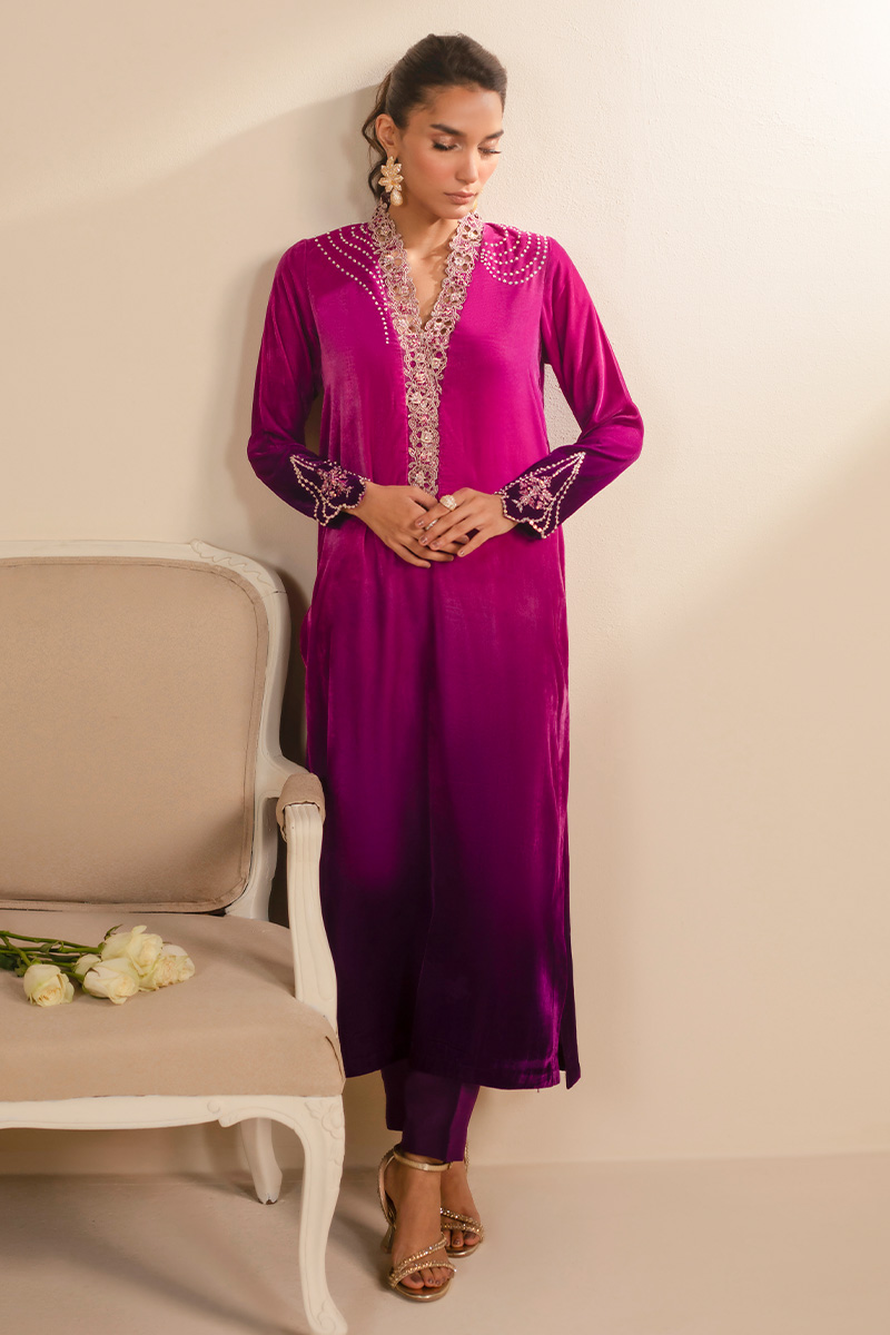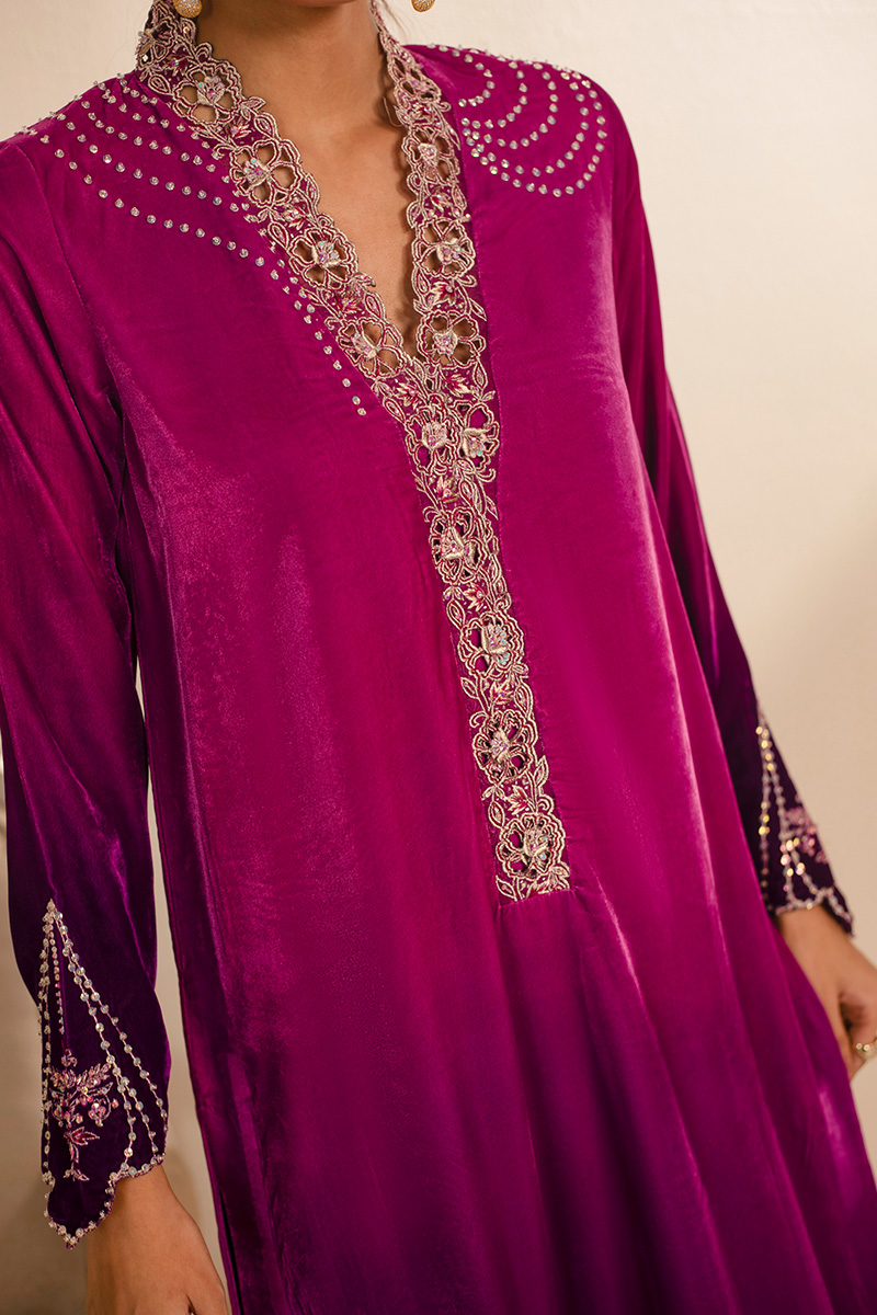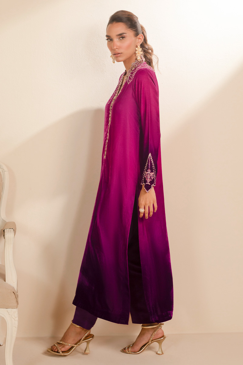 This velvet article makes a statement with its brilliant fuchsia to deep purple ombre effect, showcasing a rich color gradient across the long straight cut silhouette. The V neckline is framed by dense embroidery in light gold tilla thread and accented with delicate pearls that trail beautifully over the shoulders. Further embroidery and peal detailing enhance the scalloped edges of the cuffs, while additional floral motifs in pink and purple shades are embroidered within the cuff's design making it a bold and sophisticated statement piece.