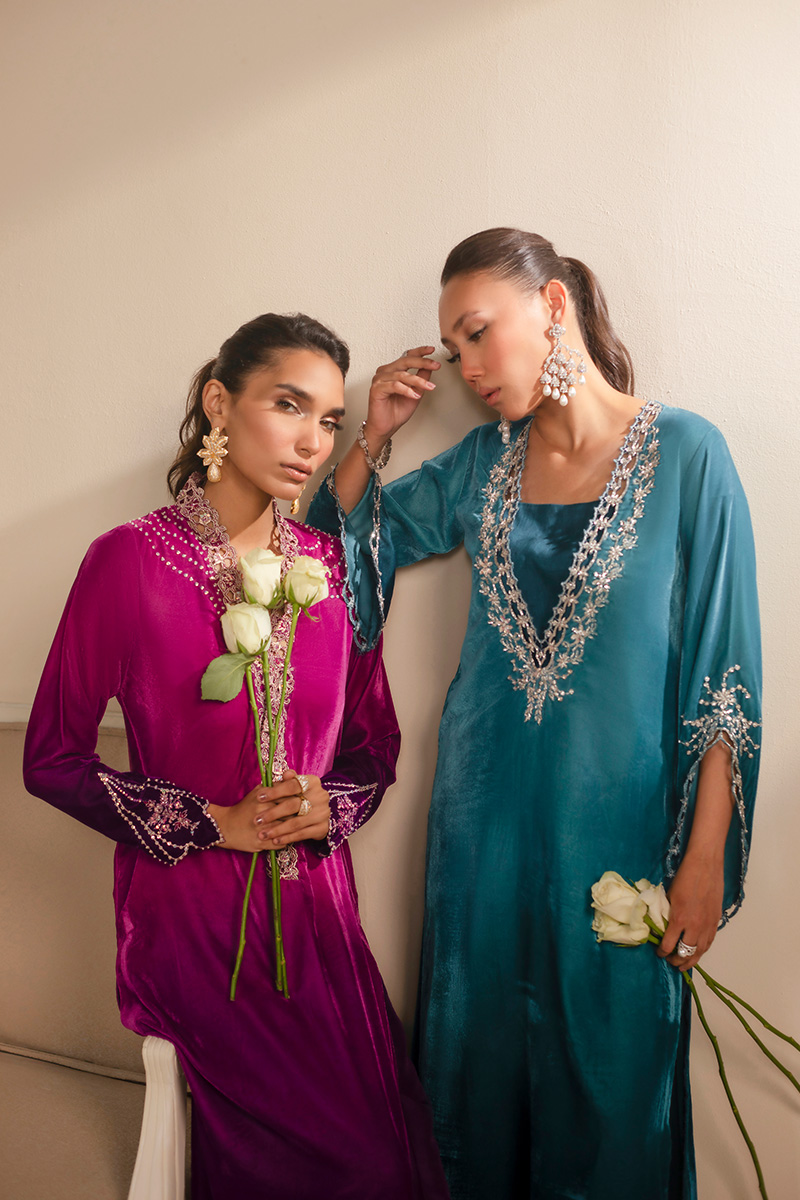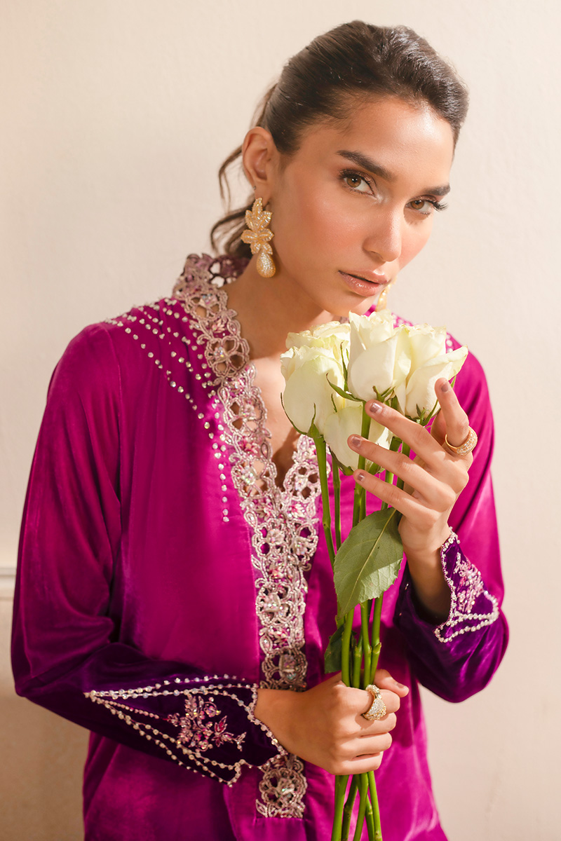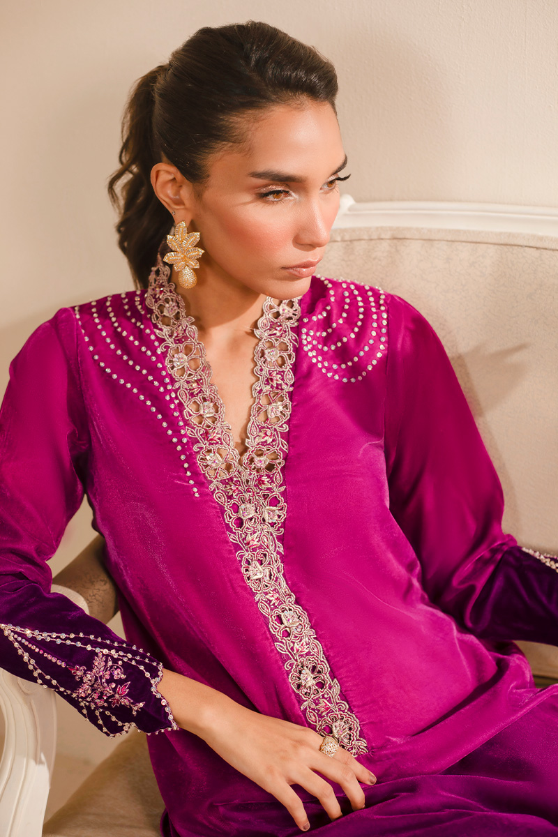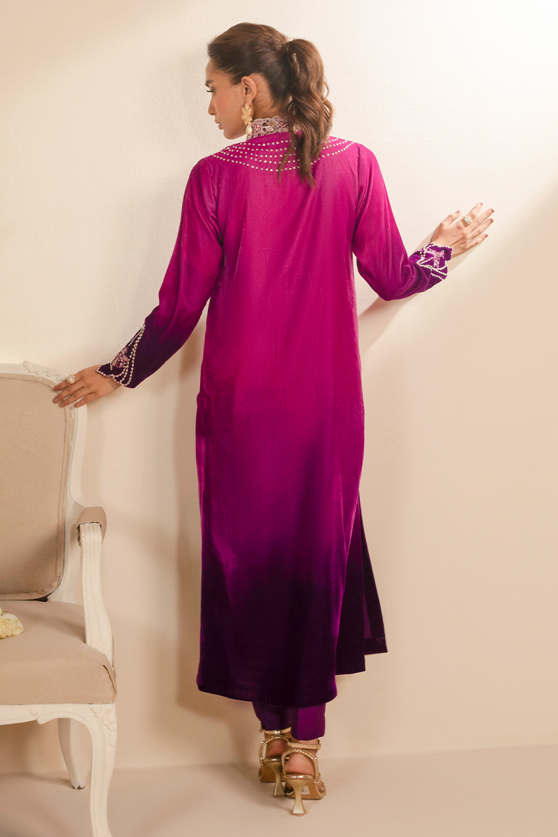 This velvet article makes a statement with its brilliant fuchsia to deep purple ombre effect, showcasing a rich color gradient across the long straight cut silhouette. The V neckline is framed by dense embroidery in light gold tilla thread and accented with delicate pearls that trail beautifully over the shoulders. Further embroidery and peal detailing enhance the scalloped edges of the cuffs, while additional floral motifs in pink and purple shades are embroidered within the cuff's design making it a bold and sophisticated statement piece.