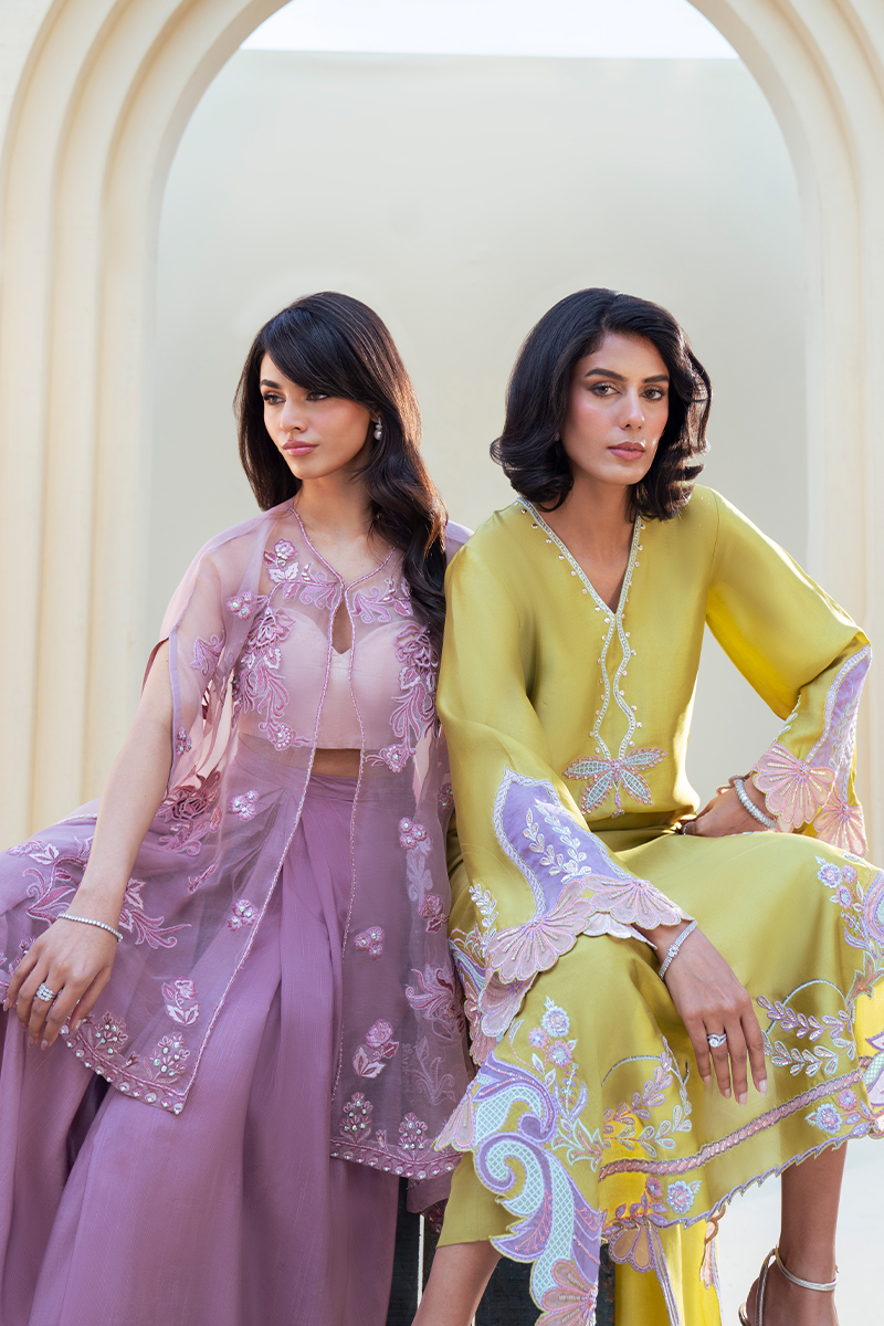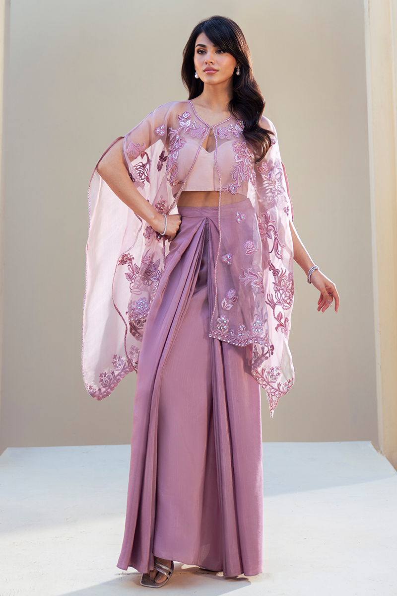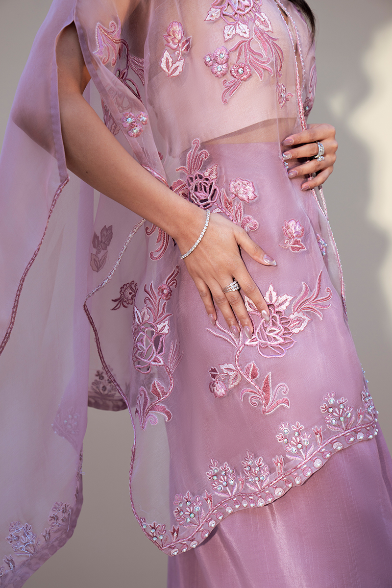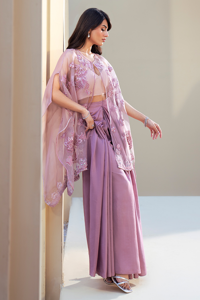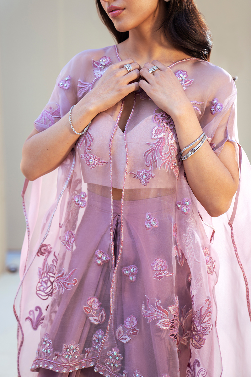 Exuding quiet luxury and refined femininity, this rose lilac ensemble is crafted from pure organza and adorned with exquisitely detailed floral artistry. Intricate cutwork motifs are meticulously hand-embellished, creating a soft interplay of texture, translucence, and shimmer. The delicately embellished hemline adds a graceful finish, enhancing the jacket’s ethereal fluidity.The sheer organza jacket is paired with an inner short slip and can be styled in a contemporary western silhouette. Accompanied by a coordinating sarong, the ensemble may also be worn with a dhoti or hem-pleated shalwar for a more traditional interpretation.Versatile yet statement-making, this couture piece transitions effortlessly between modern elegance and timeless tradition.