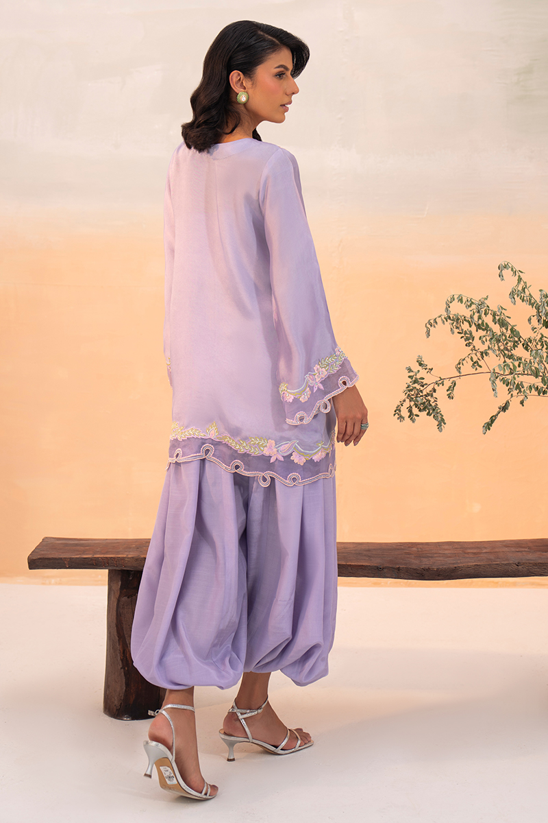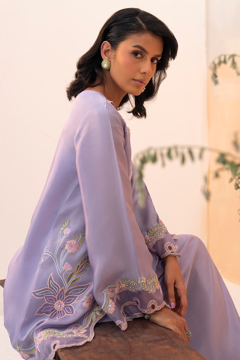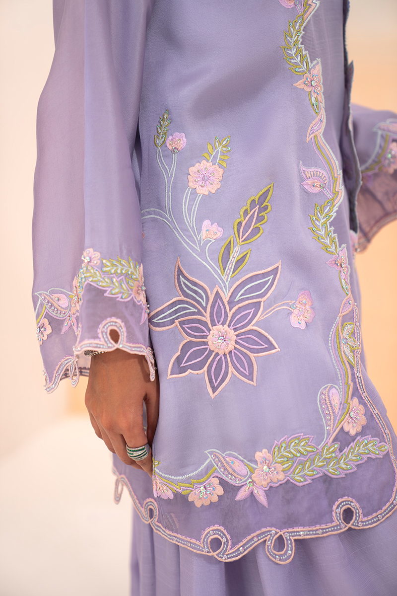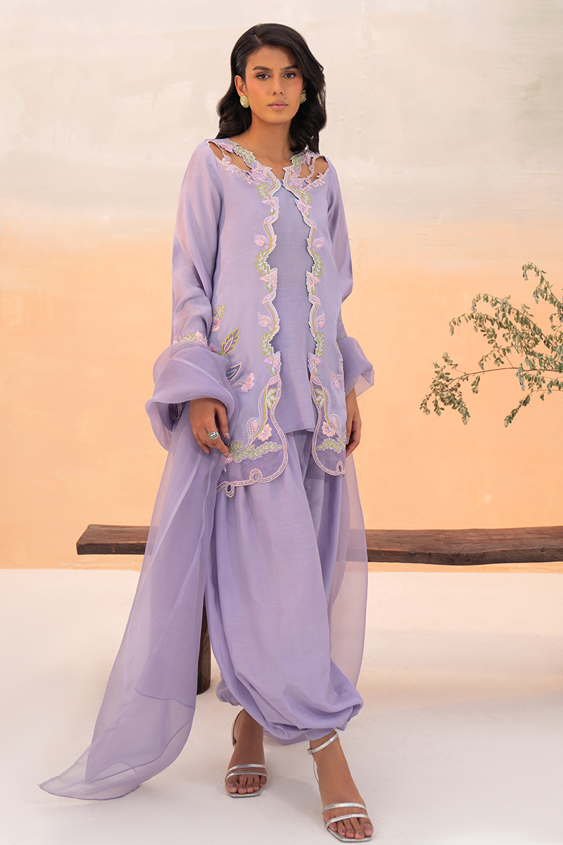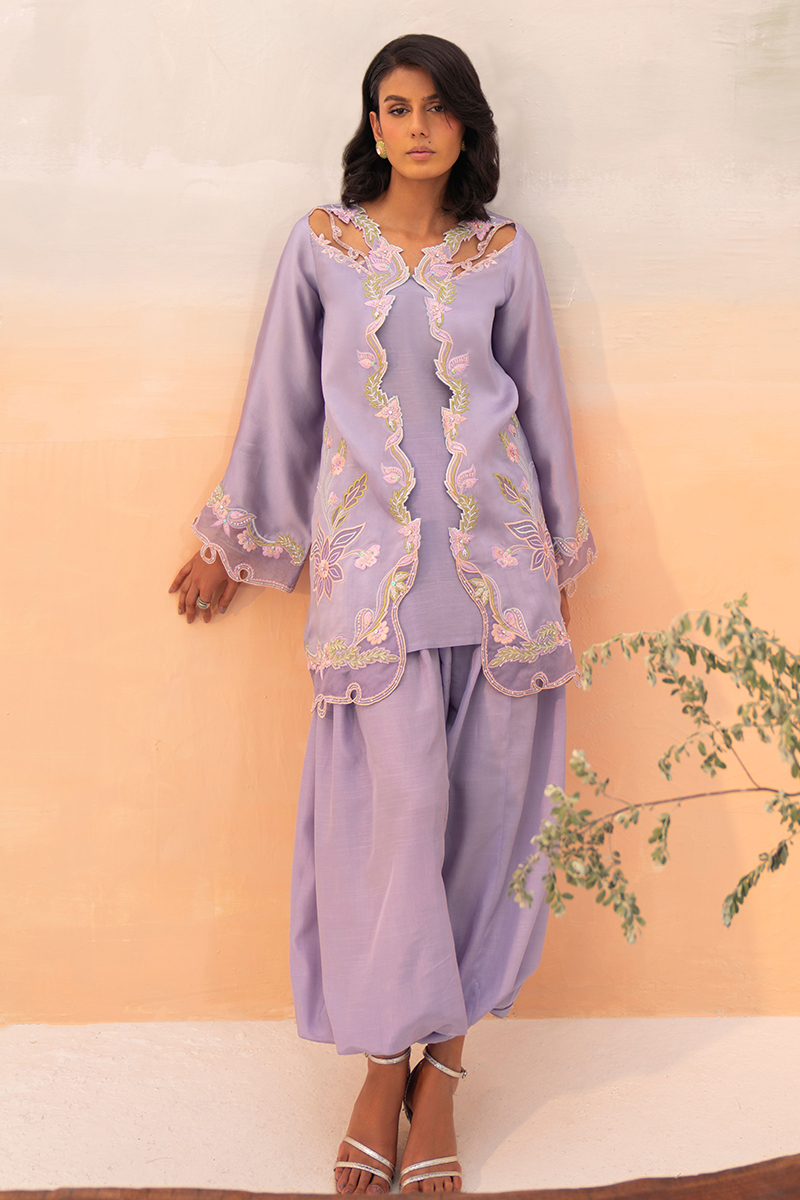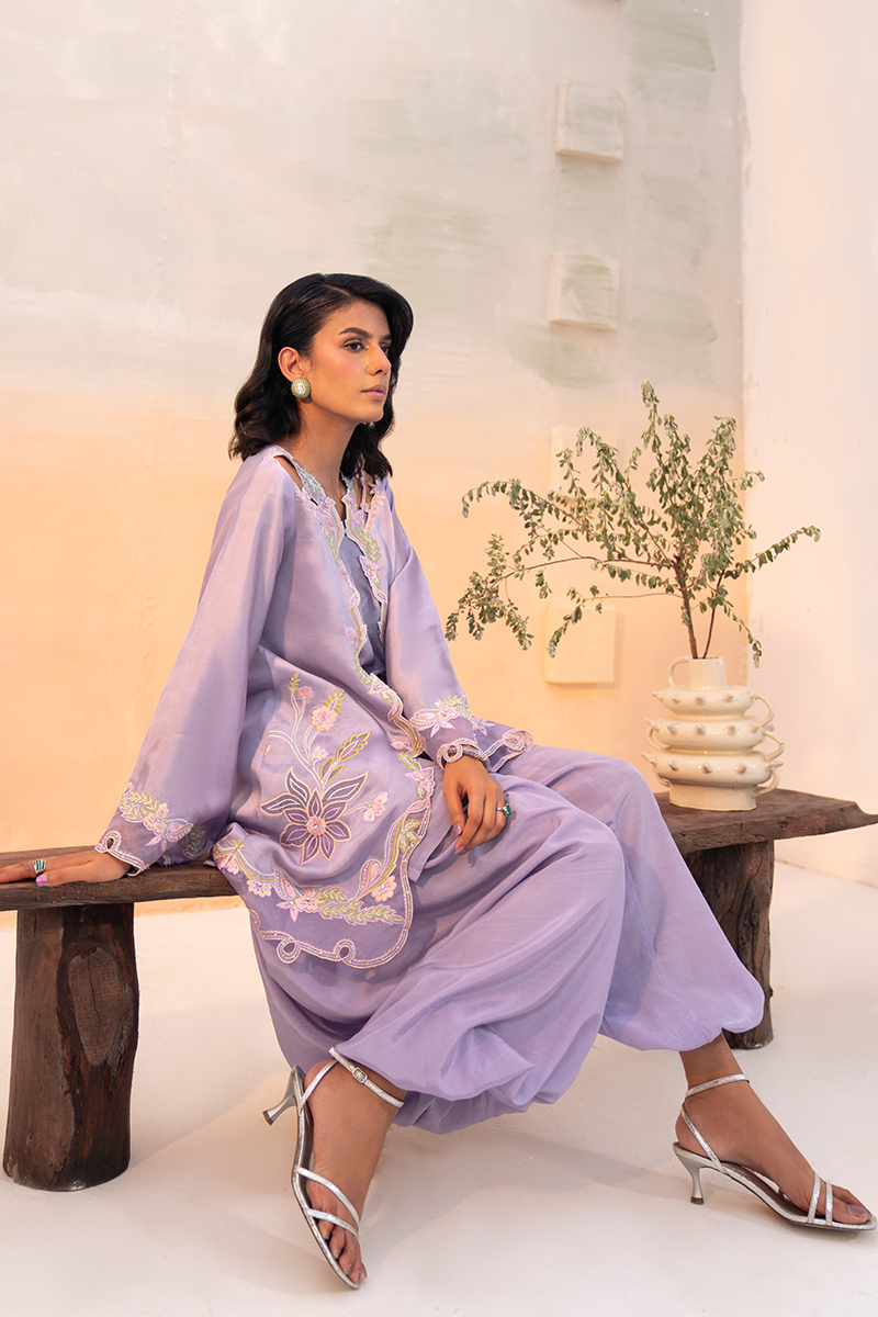 A violet-heaven short jacket in luminous silk, adorned with flowing floral patterns that cascade gracefully across its surface. The neckline features delicate cutwork extending to the shoulders, while the hem is finished with intricate appliqué detailing. Relaxed sleeves carry complementing embellishments, adding balance and refinement. Paired with an artisanal balloon-cut shalwar in Korean silk, the look achieves both structure and fluidity, holding its silhouette with elegance. A soft underslip accompanies the jacket for comfort and layering. The ensemble is completed with a pure organza dupatta, sheer and ethereal, offering a final touch of sophistication.