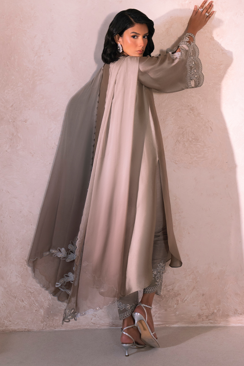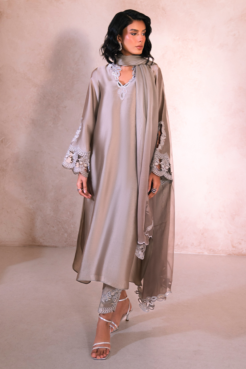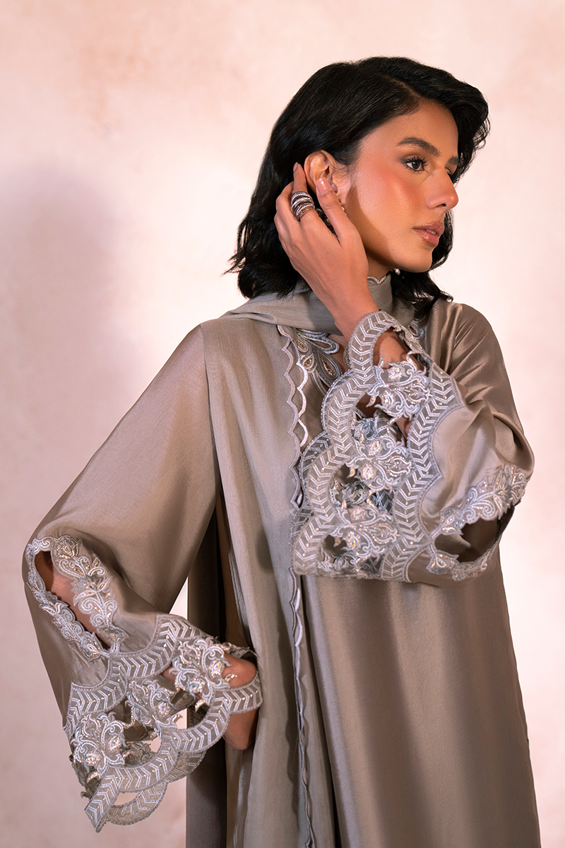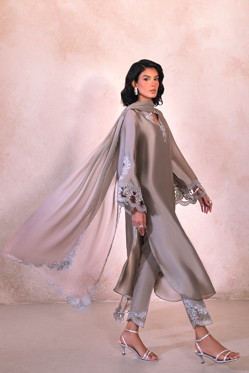 A refined trout metallic silk long shirt, exquisitely designed with a complementing neckline featuring intricate resham embroidery and delicate cutwork, further enhanced with refined appliqué embroidery and subtle diamanté embellishment for an elegant luminous finish. The silhouette is elevated with graceful bell-bottom sleeves, richly adorned with artisanal appliqué embroidery, intricate cutwork, and delicate diamanté detailing, creating depth and fluid movement. Paired with matching trousers, the hem is meticulously finished with metallic white resham outlines and pure organza appliqué embroidery, adding a polished couture edge. The ensemble is completed with an optional chiffon dupatta, delicately framed with metallic white resham scalloped edging, offering an ethereal and sophisticated finishing touch.