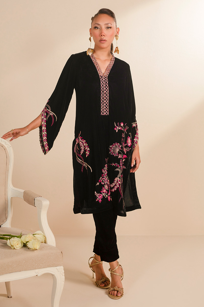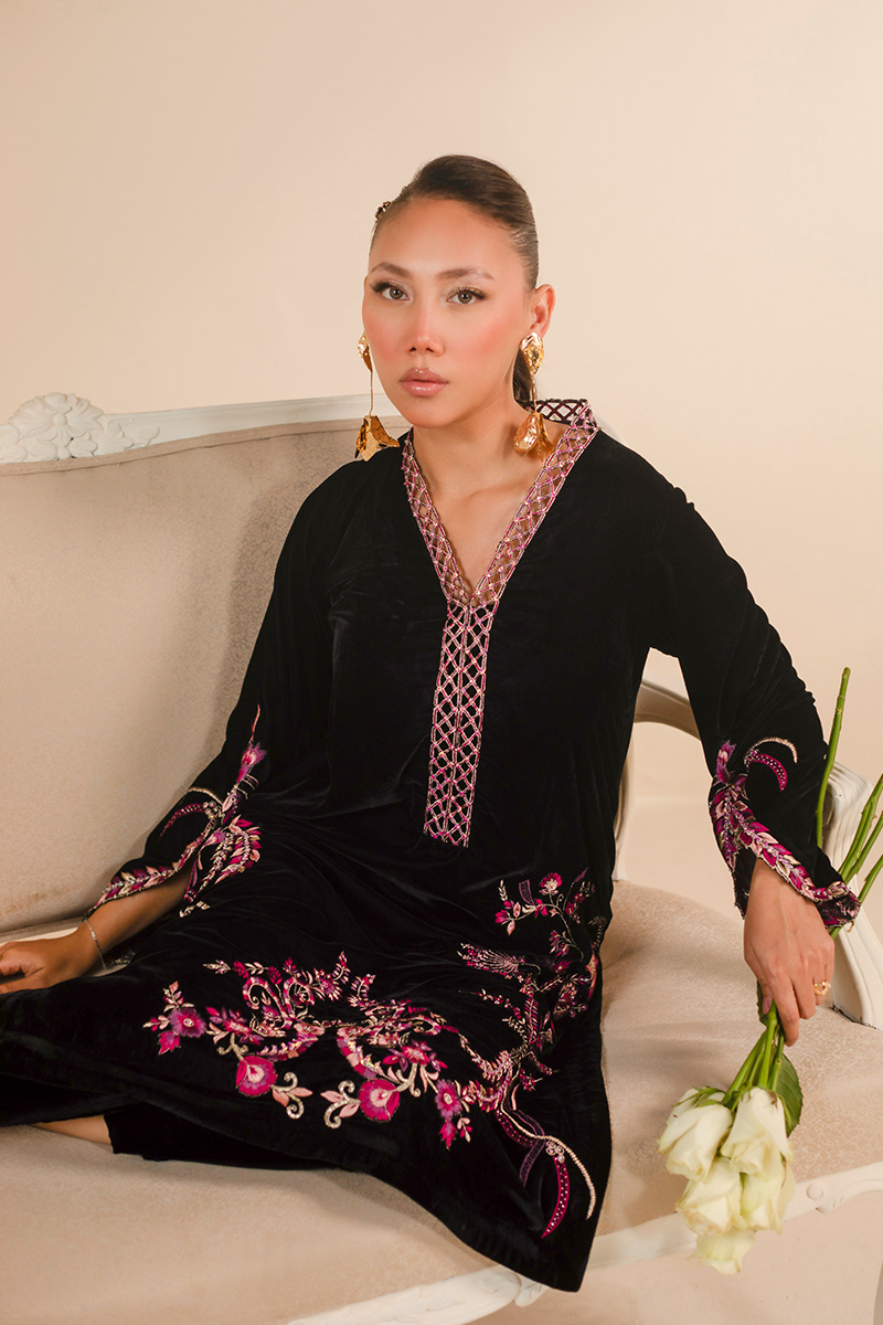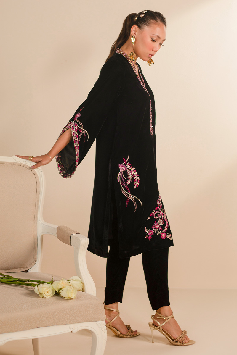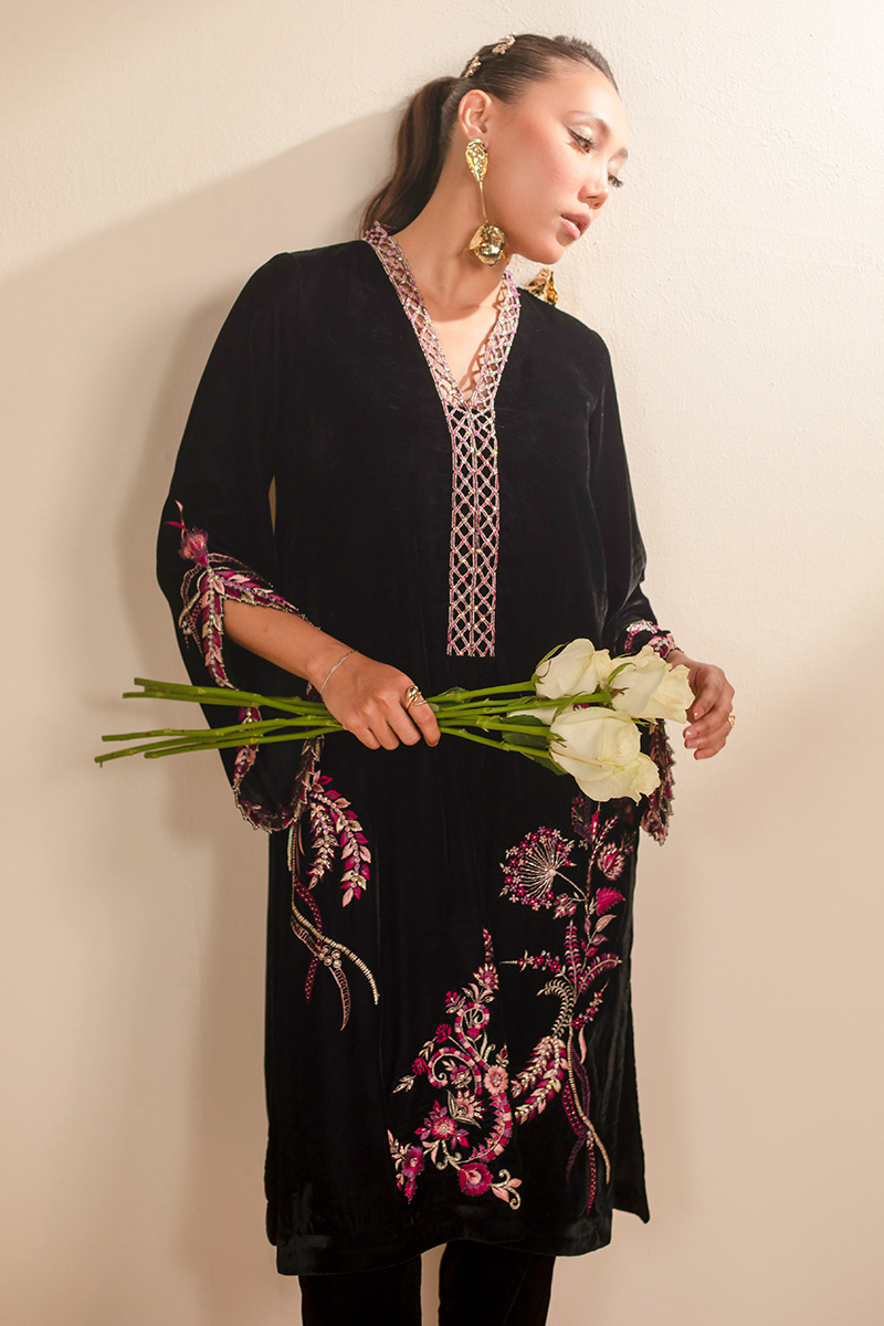 Radiate elegance with this captivating black velvet ensemble. It is adorned with beautiful embroidery and intricate resham work with sequins, zardosi and dabka work, brought to life with vibrant tones of fuchsia, rose and antique gold. The neckline showcases beautiful embroidery adding a touch of geometric charm, while sleeves are also lavishly detailed with embroidery work. This article truly reflects craftsmenship and atistic precision.