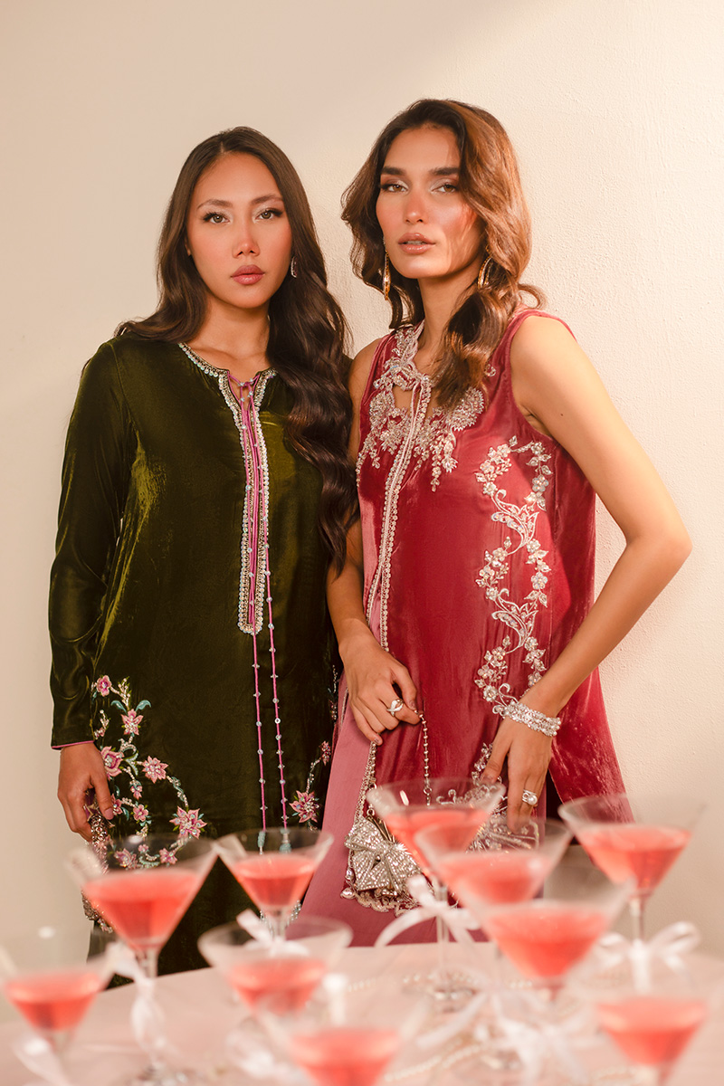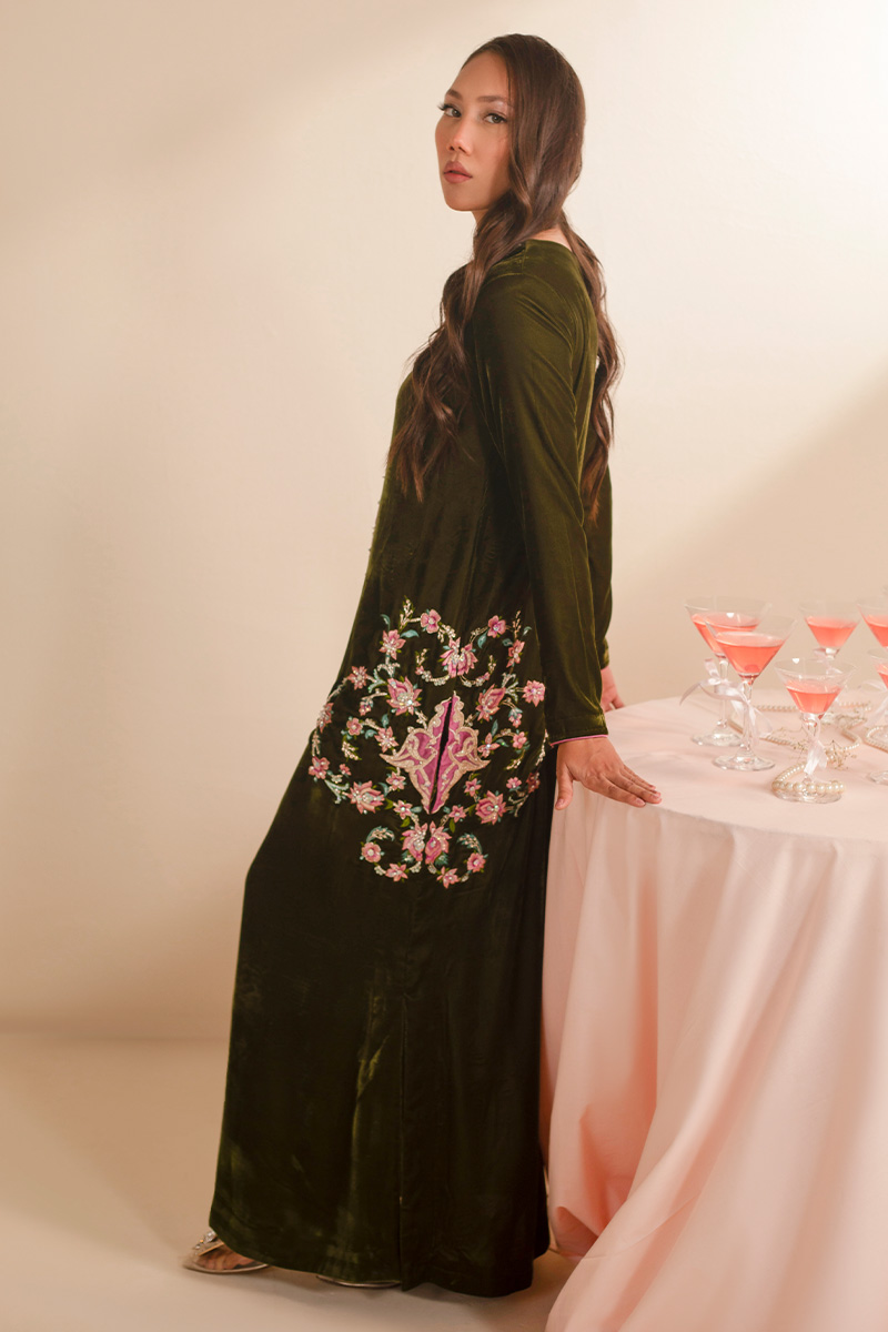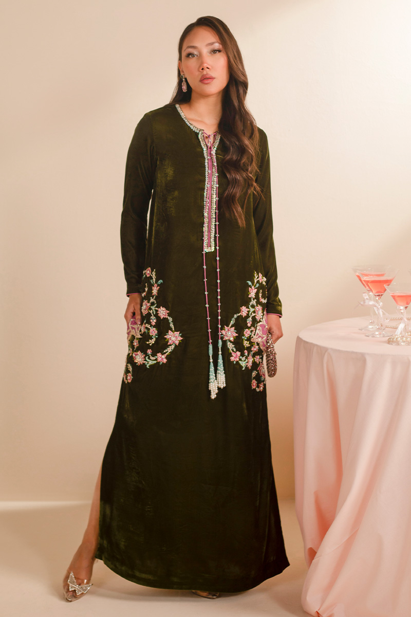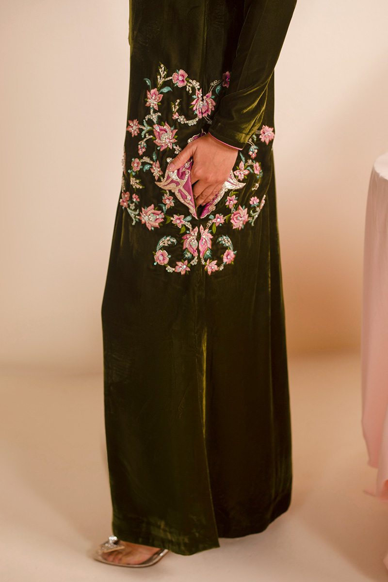 Embrace understated opulence with this stunning kaftan style velvet shirt, tailored in long straight silhouette with side slits for effortless movement. It has a rich olive green hue with beautiful embroidery in shades of rose pink, lilac, turquoise and silver creating a balance in colors. The front is accentuated with hand embellished neckline finished with crystal detailing and elegant tassel ties further enhancing the charm. The intricate floral embroidery at the waist draws the eye and embodies this peiece with timeless appeal.