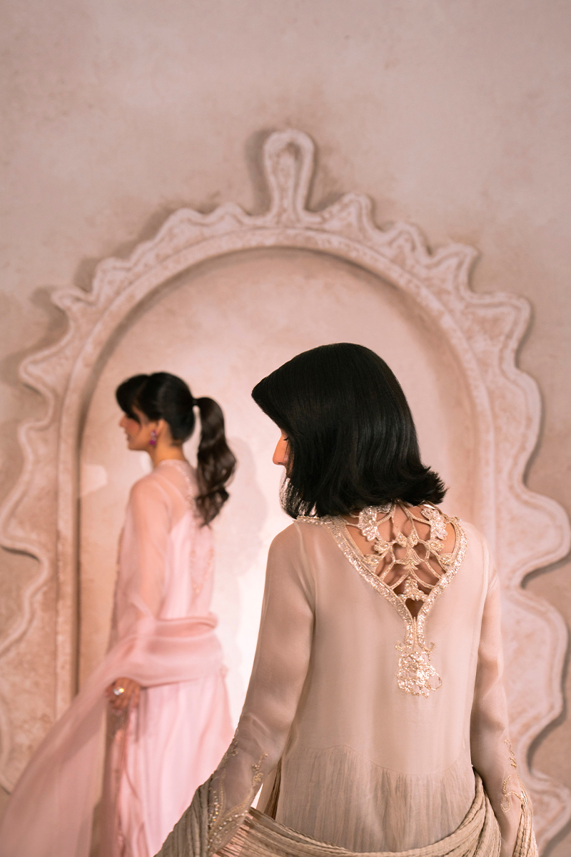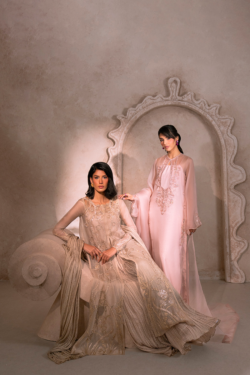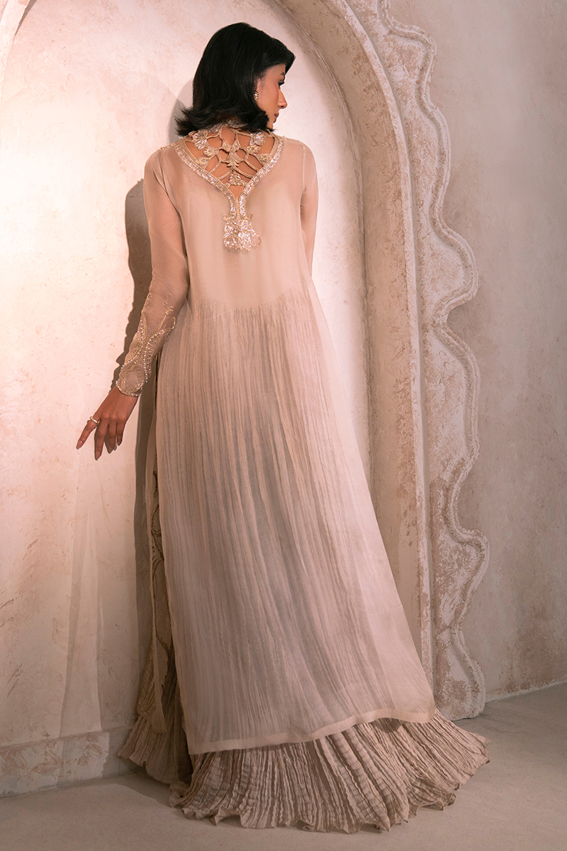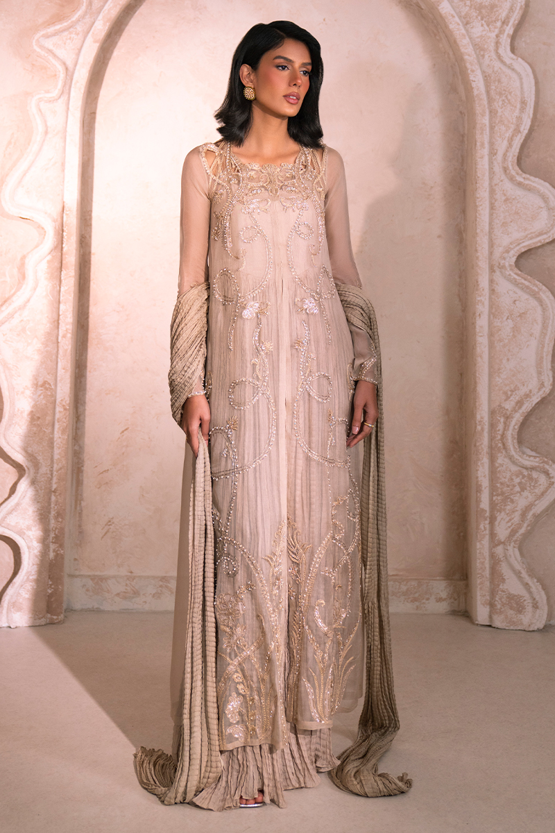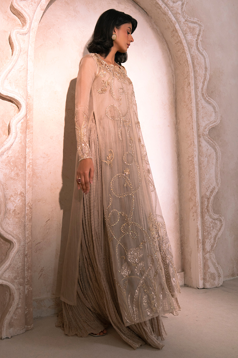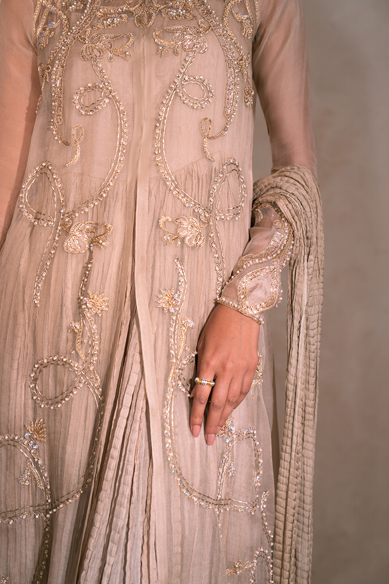 A refined tan pure organza gown, meticulously adorned with intricate cutwork detailing along the front and back neckline. The shoulders are delicately embellished with hand-crafted floral motifs, featuring sequins, pearls, resham, and nakshi dabka, gracefully cascading across the gown panels. The sleeves mirror this artisanal craftsmanship, enhancing the ensemble’s opulent appeal. A long crushed silk inner slip lends effortless movement, volume, and a fluid, regal silhouette. The look may be completed with an optional crushed silk dupatta and tailored trousers, adding a timeless layer of sophistication and understated grandeur.
