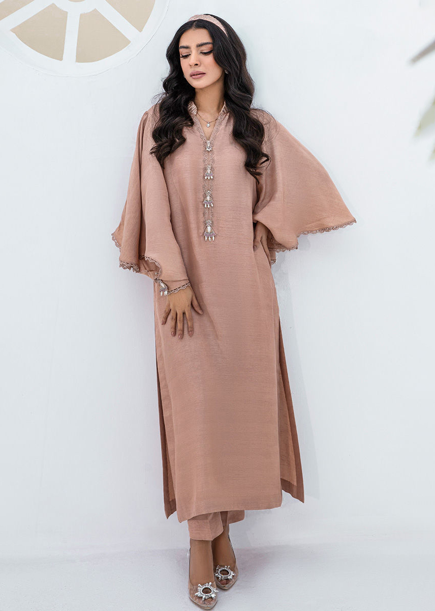 This beautiful shirt with intricately embellished buttons set on a lace neckline with beautiful flailed out sleeves with lace detailing. Paired with a hand block printed silk dupatta and matching pants.