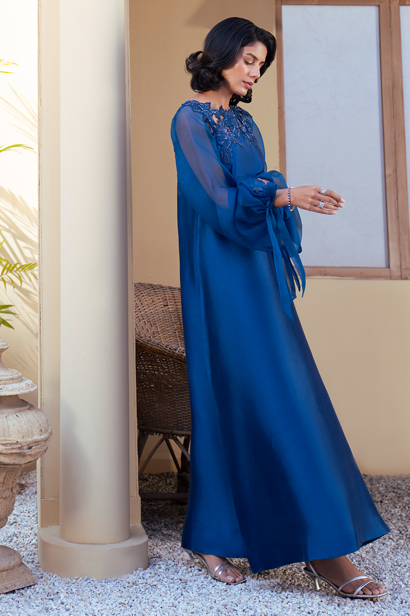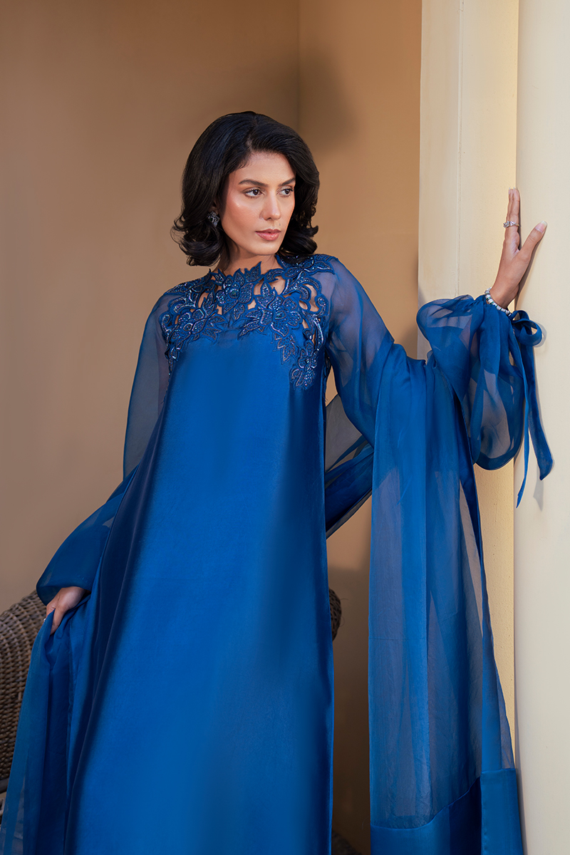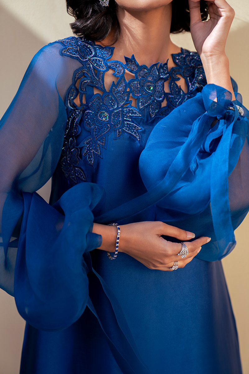 Draped in a rich sapphire blue silk, this artisary kaftan radiates regal sophistication. The neckline is delicately adorned with appliqué and cutwork, fully embellished to create a striking blue‑on‑blue sapphire effect that feels both royal and timeless. The sleeves, styled in a French balloon cut, add volume and grandeur, enhancing the kaftan’s opulent silhouette.Completing the ensemble, a sheer organza dupatta with silk‑finished edges offers a graceful complement, while the silk trousers provide balance and refinement. This creation embodies heritage craftsmanship elevated with couture‑inspired detailing, perfect for formal and festive occasions.