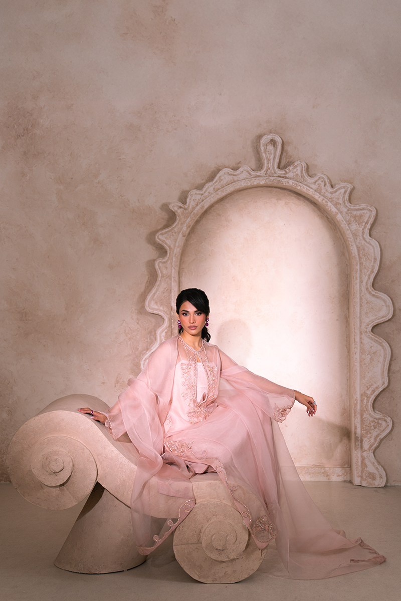 A delicate powder pink pure organza shirt, exquisitely designed with an elongated diamond-cut neckline, richly hand-embellished with lustrous pearls, shimmering sequins, and opulent rose gold pitta work. Graceful floral motifs cascade along the neckline, seamlessly extending into hand-embellished patterns that flow across the shirt panels and hem. The waistline is subtly enhanced with refined floral detailing, while the hem is further adorned with complementary motifs, adding depth and balance to the silhouette. Loose, fluid sleeves feature coordinated embellishment, echoing the craftsmanship of the front, while the back neckline is equally adorned with the same intricate design language. The ensemble is paired with a silk inner slip for structure and comfort, complemented by matching silk trousers. A pure organza dupatta, available as an addition, is delicately finished with coordinating embellishments along the pallu edges, completing the look with timeless elegance and couture sophistication.