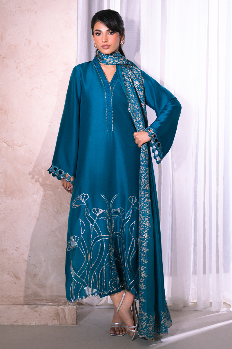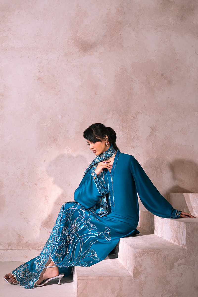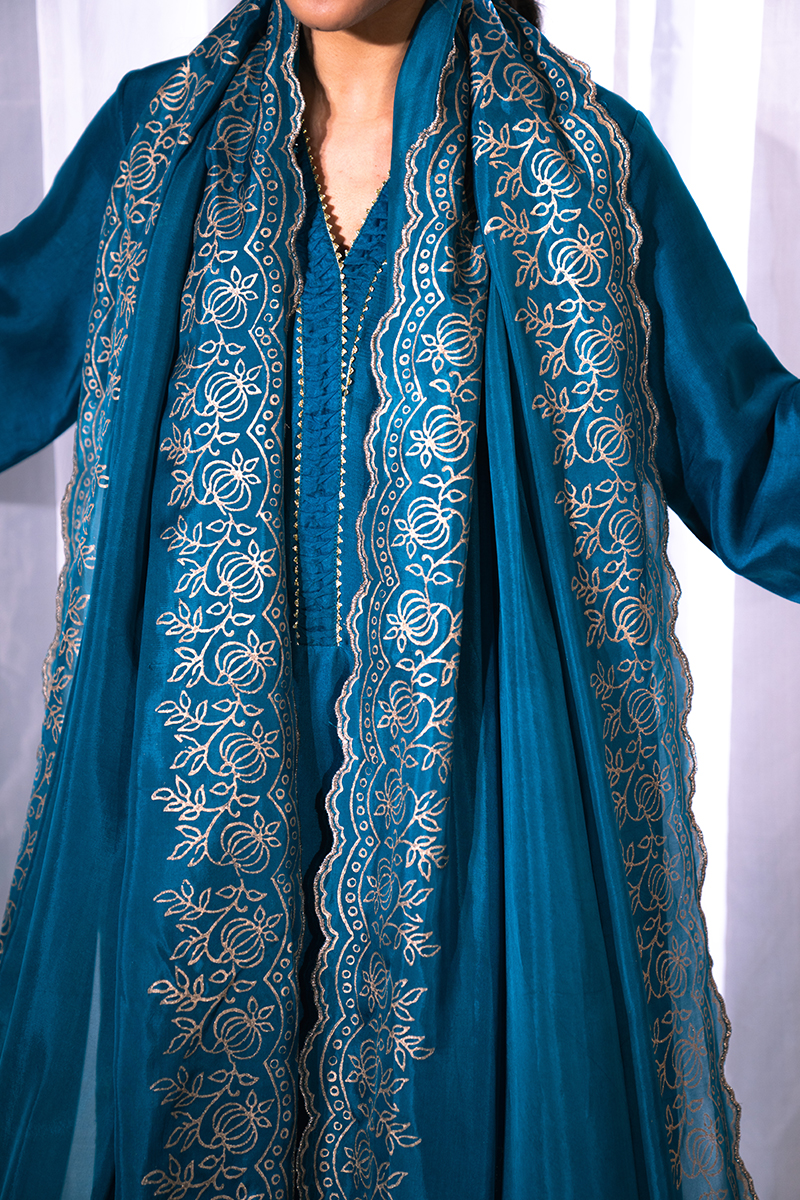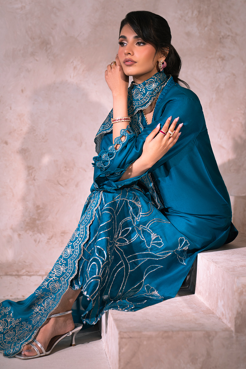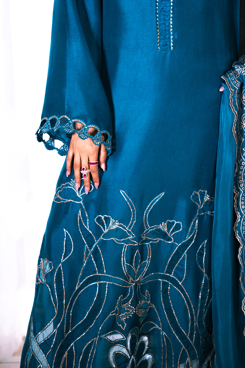 A refined expression of modern luxury, this tropical blue silk ensemble is designed with timeless elegance. The long silk shirt features a graceful V band neckline, finished with a golden edging that adds a refined accent. The sleeves are delicately detailed with cutwork, enhanced with fine golden pitta work outlining for an artisanal touch. The shirt hem is adorned with intricate organza appliqué cutwork, beautifully enhanced with rich golden pitta embroidery and scalloped edges, creating a statement finish. Paired with a coordinated silk trouser, the ensemble is completed with a luxurious silk dupatta featuring rich golden block printing, lending depth, heritage, and sophistication to the overall look. A distinguished creation crafted for those who appreciate understated luxury and meticulous craftsmanship.