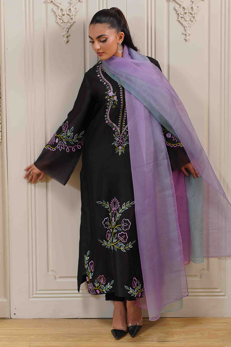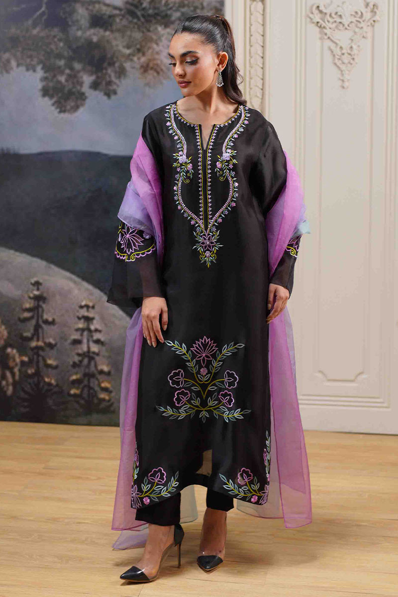 Step into a world of timeless elegance with this exquisite black silk ensemble, a masterpiece of artistry and craftsmanship. The ensemble embodies grace and sophistication, perfect for the discerning woman who values both style and tradition. The shirt is delicately adorned with intricate multicolored floral embroidery, showcasing a stunning blend of lavender, lilac, and mint green threads. The vibrant floral patterns are thoughtfully placed along the neckline, sleeves, and hemline, reflecting a garden in full bloom.