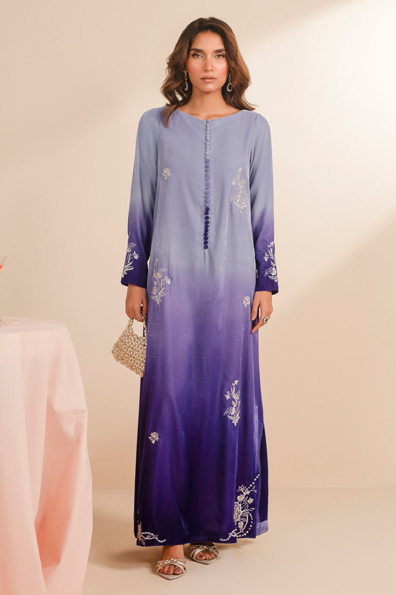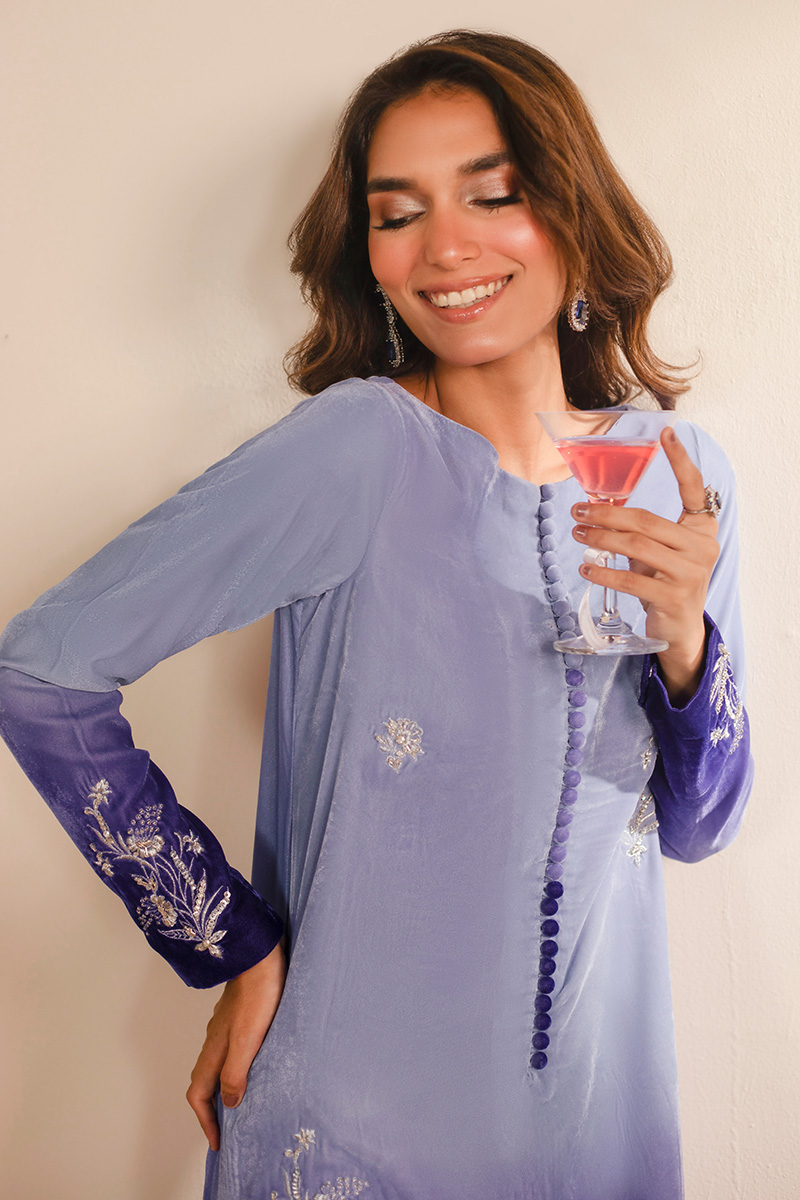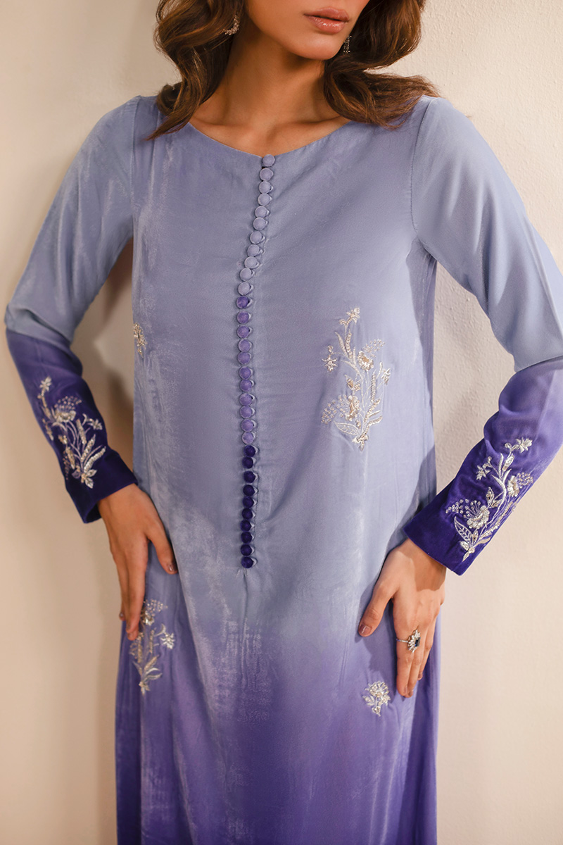 This exquisite article is crafted in ombre velvet, transitioning from a pastel lilac from the necckline towards a deep purple at the hemline. It features a classic round neckline with loop button detailing in the middle front. Delicate embroidered floral motifs in off white resham and light gold tilla are elegantly scattered on the long straight silhouette, concentrated along the sleeve cuffs and forming more elaborate patterns at the hemline of the shirt, providing a very subtle yet sophisticated look.