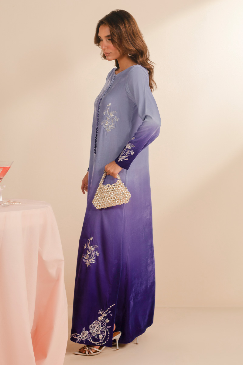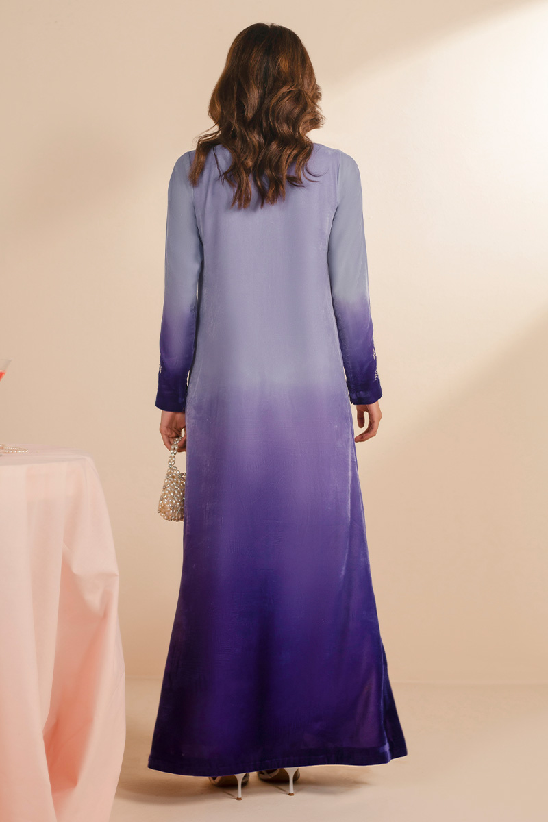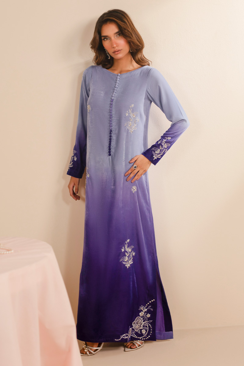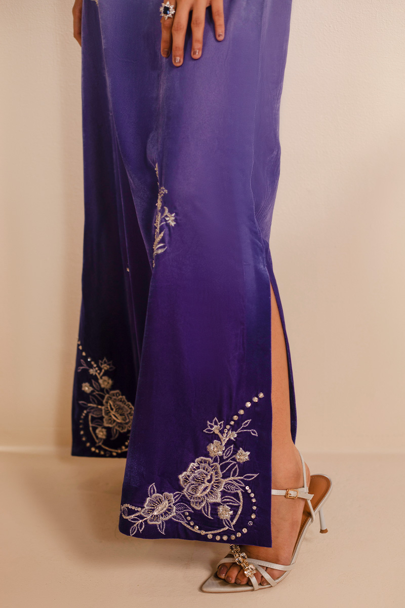 This exquisite article is crafted in ombre velvet, transitioning from a pastel lilac from the necckline towards a deep purple at the hemline. It features a classic round neckline with loop button detailing in the middle front. Delicate embroidered floral motifs in off white resham and light gold tilla are elegantly scattered on the long straight silhouette, concentrated along the sleeve cuffs and forming more elaborate patterns at the hemline of the shirt, providing a very subtle yet sophisticated look.