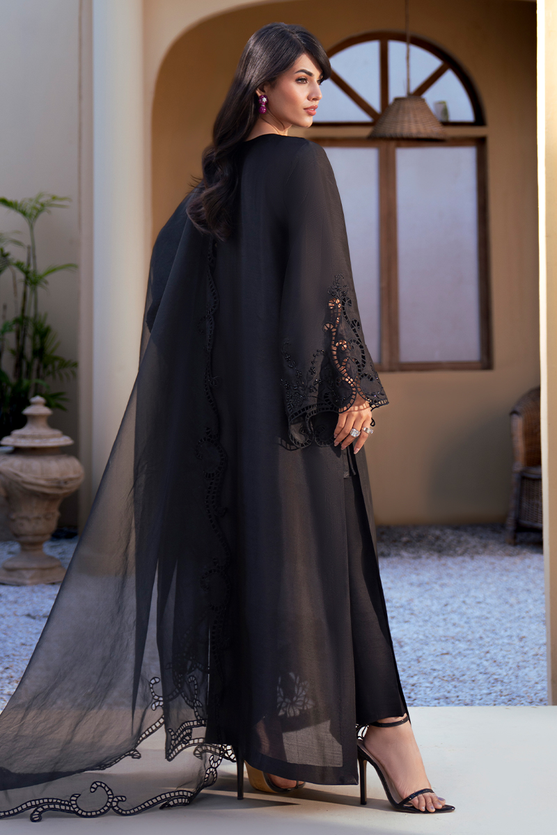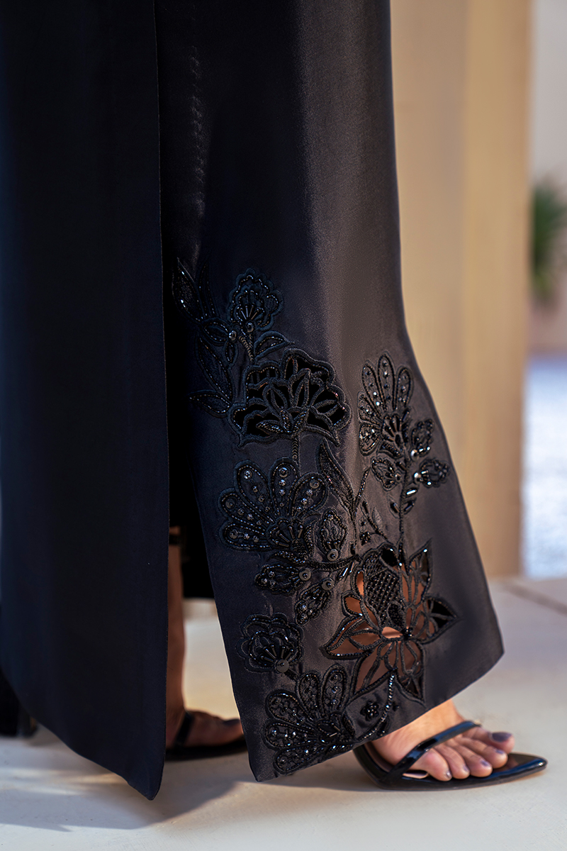 This striking raven black shirt is a masterpiece of tonal artistry, featuring black‑on‑black cutwork and cut‑dana embellishment along the neckline for a subtle yet opulent shimmer. The bell‑bottom sleeves are fully adorned with intricate detailing, while the hemline carries matching cutwork and floral motifs outlined with embellishment, creating depth and refinement.The look is completed with a sheer organza dupatta, finished with scalloped cutwork edges, and paired with silk trousers for a cohesive, luxurious silhouette. This ensemble embodies modern elegance with heritage craftsmanship, perfect for evening wear and formal occasions.