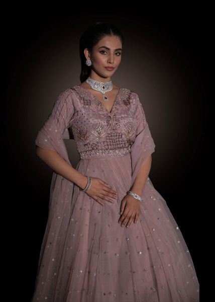 The lilac peshwas has intricate cutdana and zardozi work all over with a geometric sitara border and heavy sitara spray all over. Paired a net dupatta with embellished motifs on all four corners and sequin spray. The regal silk lehnga gives outfit the right structure and flare.