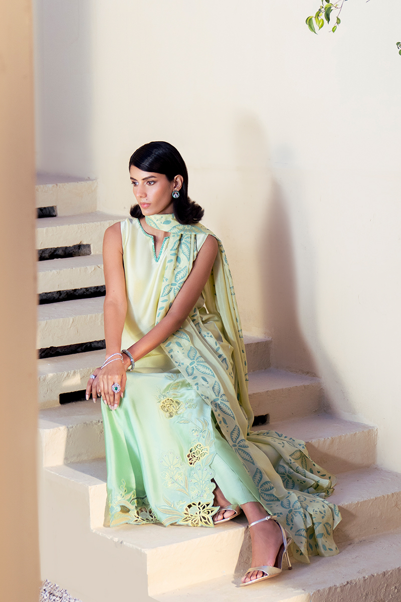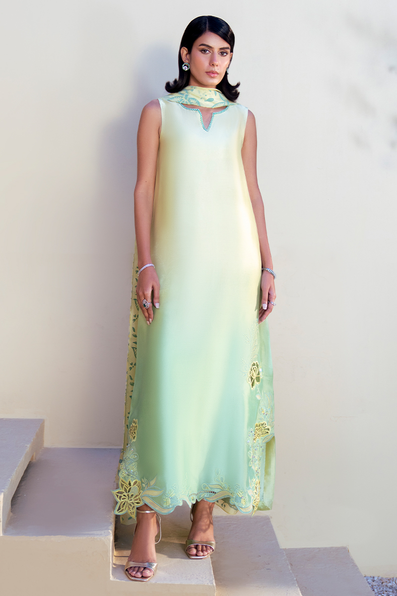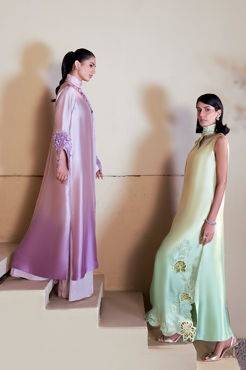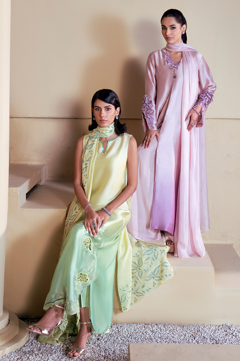 This flowing ombre silk shirt, blending soft yellow into green, is a statement of refined elegance. The neckline is kept minimal and composed, allowing the artistry of the garment to shine. Along the hemline, a graceful floral appliqué pattern unfolds, enriched with cutwork and resham outlines, balanced with delicate embellishment for a sophisticated finish.The silk dupatta complements the kaftan with block‑printed floral and leafy motifs, harmonizing the contrasting tones of mint yellow and mint green. Paired with silk trousers, the ensemble embodies a perfect fusion of heritage craftsmanship and contemporary luxury, ideal for festive and formal occasions.